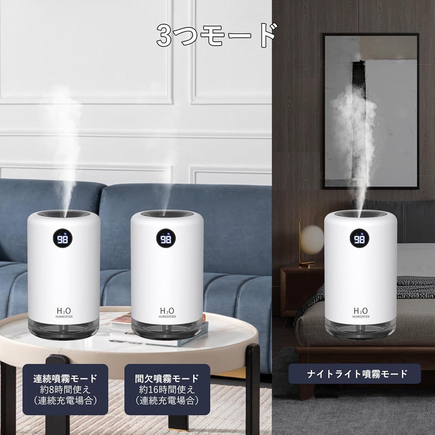 加湿器 卓上 小型 【2024冬新登場・超音波式・節電対策・デジタル残量表示】卓上加湿器 除菌 コードレス対応 充電式 空焚き防止 静音 2000mAh大容量バッテリー 乾燥対策 花粉症対策 車用加湿器 寝室/リビング/オフィス適用