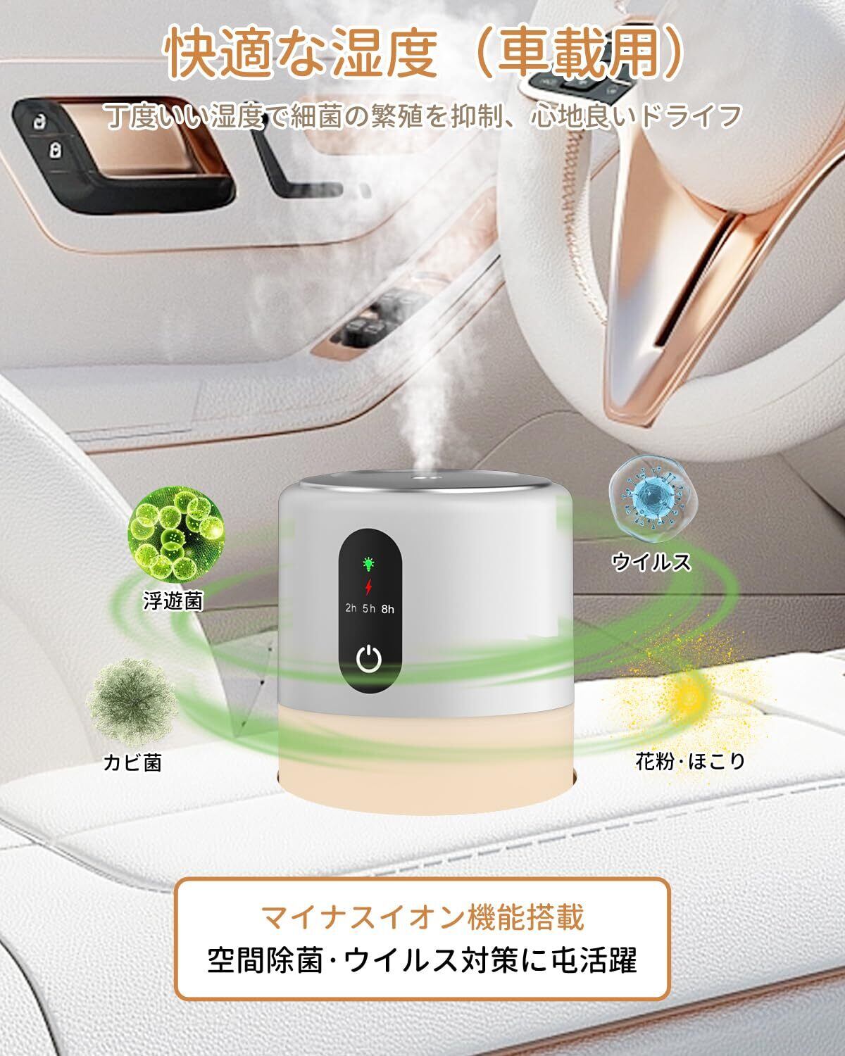 【用途が広範囲】加湿器の用途は非常に広範囲です。自動車、寝室、オフィス、寮、リビング、書斎、子供部屋、老人部屋などに応用でき、いずれの場所でも重要な役割を果たします。また、加湿器は花粉、鼻、のど、肌の乾燥を防ぎ、静電気も防止します!花粉が舞う季節には、アレルギー症状を軽減し、呼吸をよりスムーズにします。乾燥しやすい鼻やのどに対して、加湿器は湿りを保ち、不快感を減らします。(※、芳香はサポートしていません。純粋な加湿体験に専念させ、香りによる不快感やアレルギー反応を避けます。)