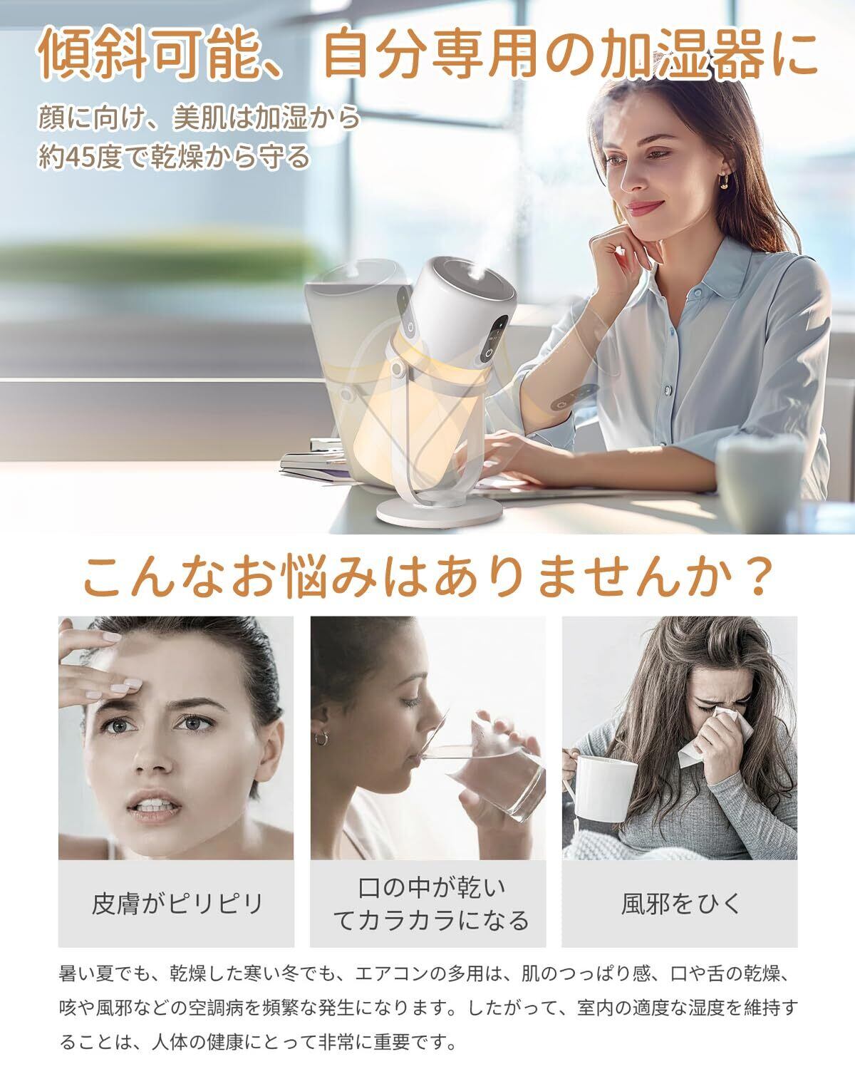 【角度調整可能&超微細ミスト搭載】本小型 加湿器は新シングルノズル設計で、高性能の超音波振動子を搭載し、従来よりミストの勢いが大幅にパワーアップ!この ミニ加湿器は、自由に回転可能な設計で、加湿の方向をお好みに調整でき、部屋全体を均一に加湿します。広い範囲をしっかりカバーしつつ、密閉構造により水漏れの心配がありません。また、最新の超音波技術を採用し、水を約5μmの超微細ミストに変換。浸透力がさらに向上し、乾燥する秋冬の季節に、肌や唇の潤いを保つのに最適です!