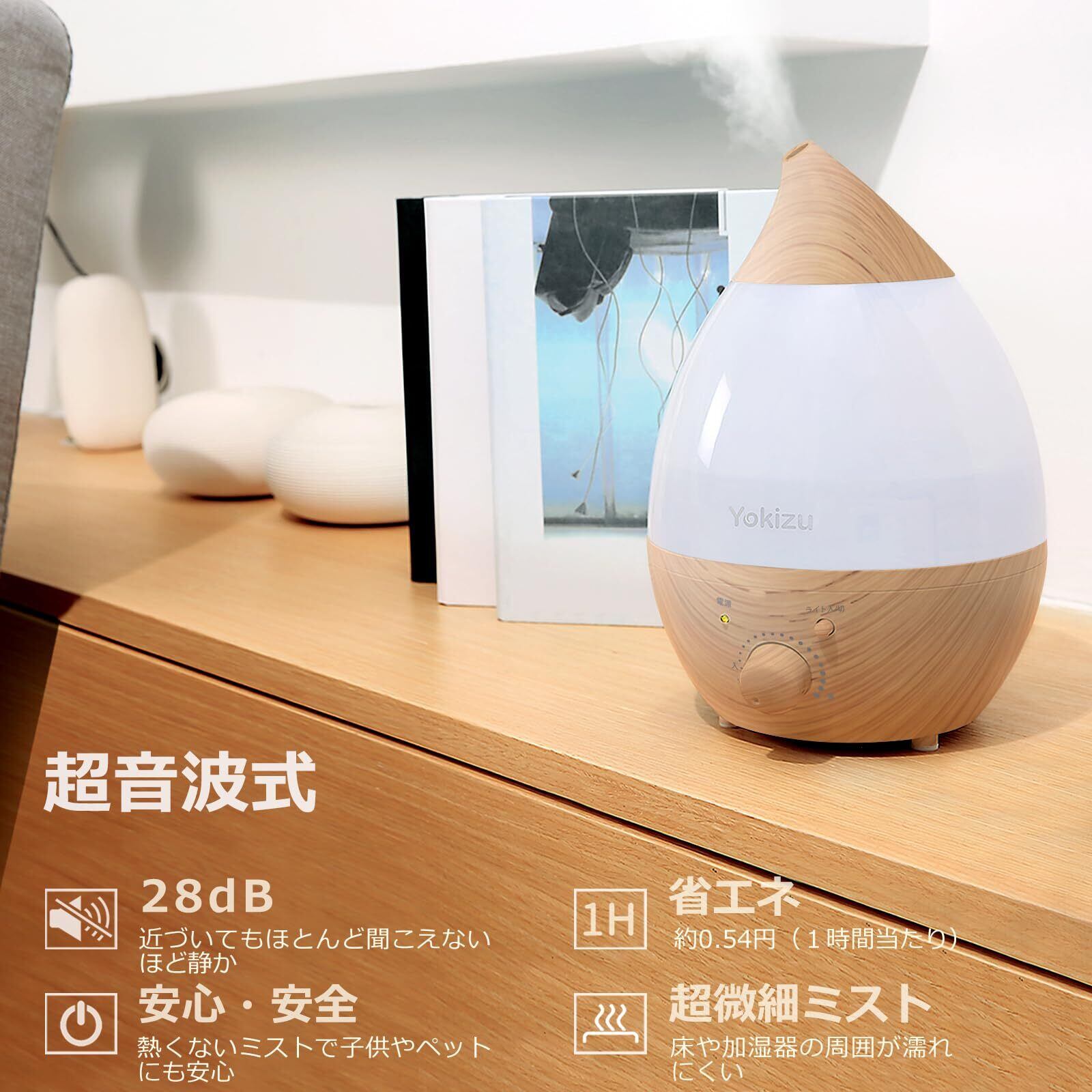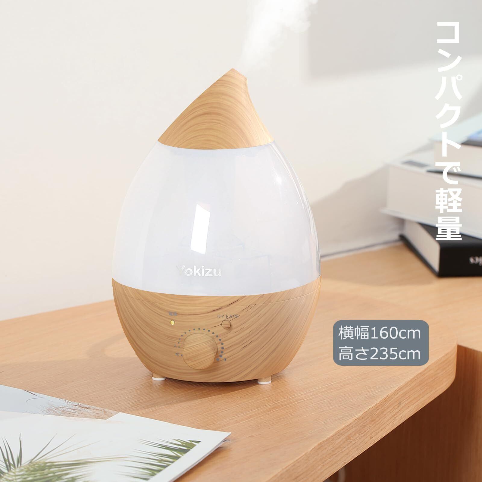 Yokizu 加湿器 小型 卓上 大容量 除菌 アロマ 超音波式 LEDライト しずく型 お手入れしやすい 静音 省エネ 加湿機 次亜塩素酸水対応 デスク オフィス 寝室 リビング 乾燥対策 焚き防止 おしゃれ コンパクト 6-10畳 木目ナチュラル