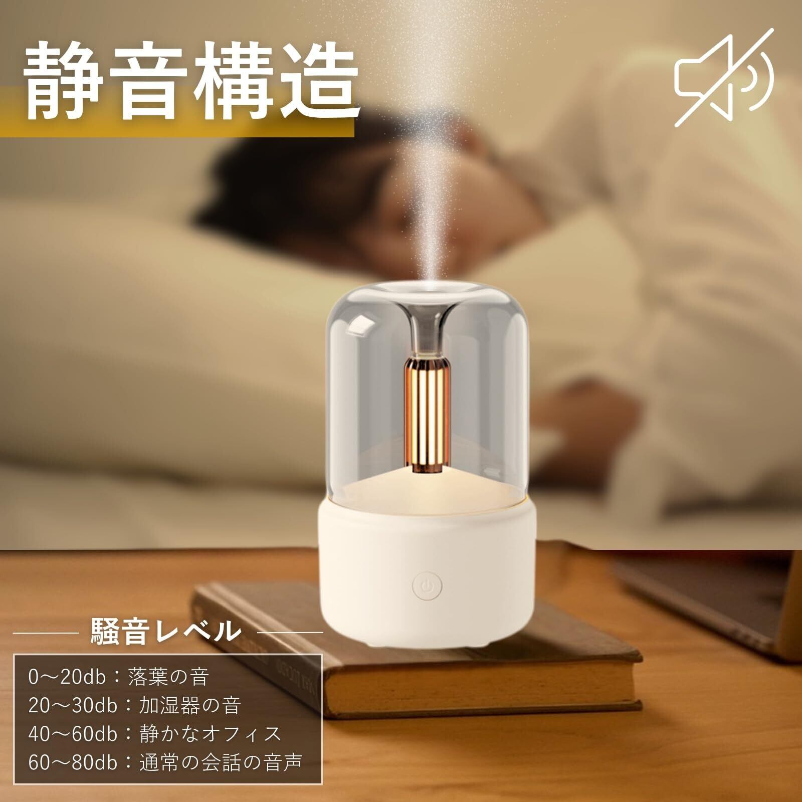 【小型静音持ち運び便利】アロマディフューザーの直径は9.5cm、高さは15cmで、コンパクトで持ち運びやすいです。音は30デシベルで、超音波振動で動作し、従来のアロマディフューザーよりも静かで、睡眠時の使用に適しています。