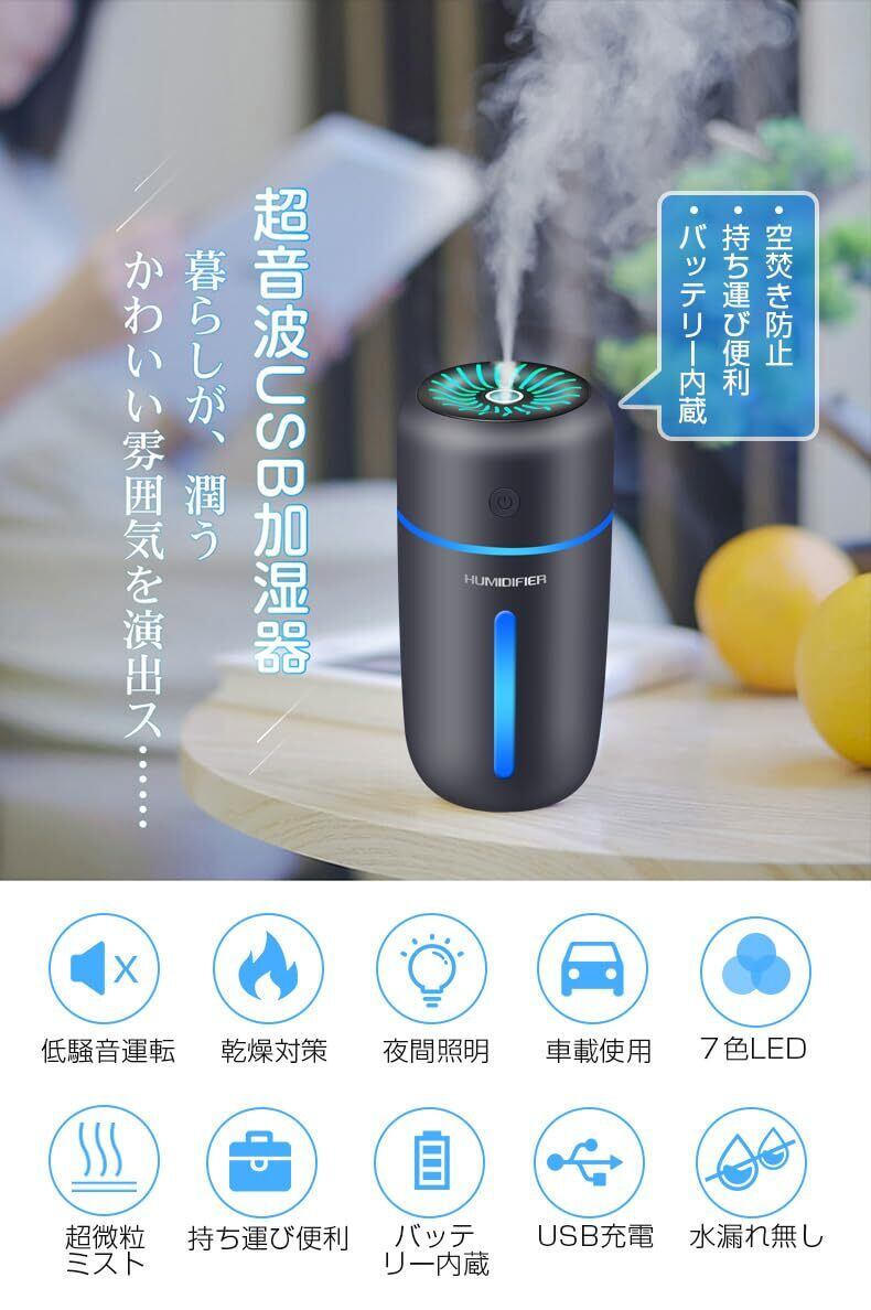 加湿器 卓上 小型 車用加湿器 Type-C充電式 350ml 大容量 超音波式 除菌 次亜塩素酸水対応 空焚き防止 静音 コンパクト 乾燥 花粉対策 車載 フィス オフィス 7色LEDライト 寝室 アロマ 日本語説明書付き (ブラック)