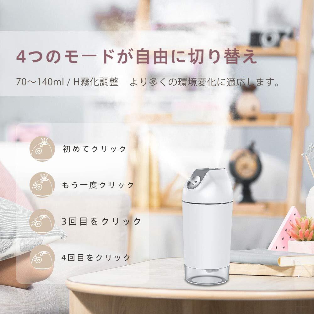 HandFan 加湿器 卓上 小型 亜塩素塩酸水対応 USB充電式 2600mAh 空焚き防止搭載 大ミスト噴出量 ダブルノズル 最大140ml / H 超音波式 480ml大容量 ペットボトル LEDライト付き 携帯用 車載用 オフィス乾燥対策(グレー)