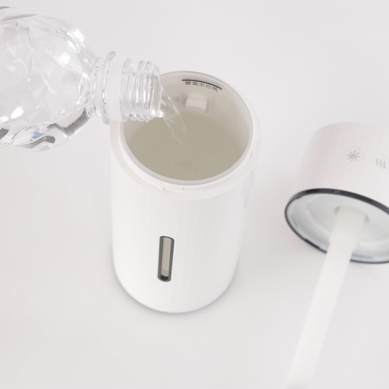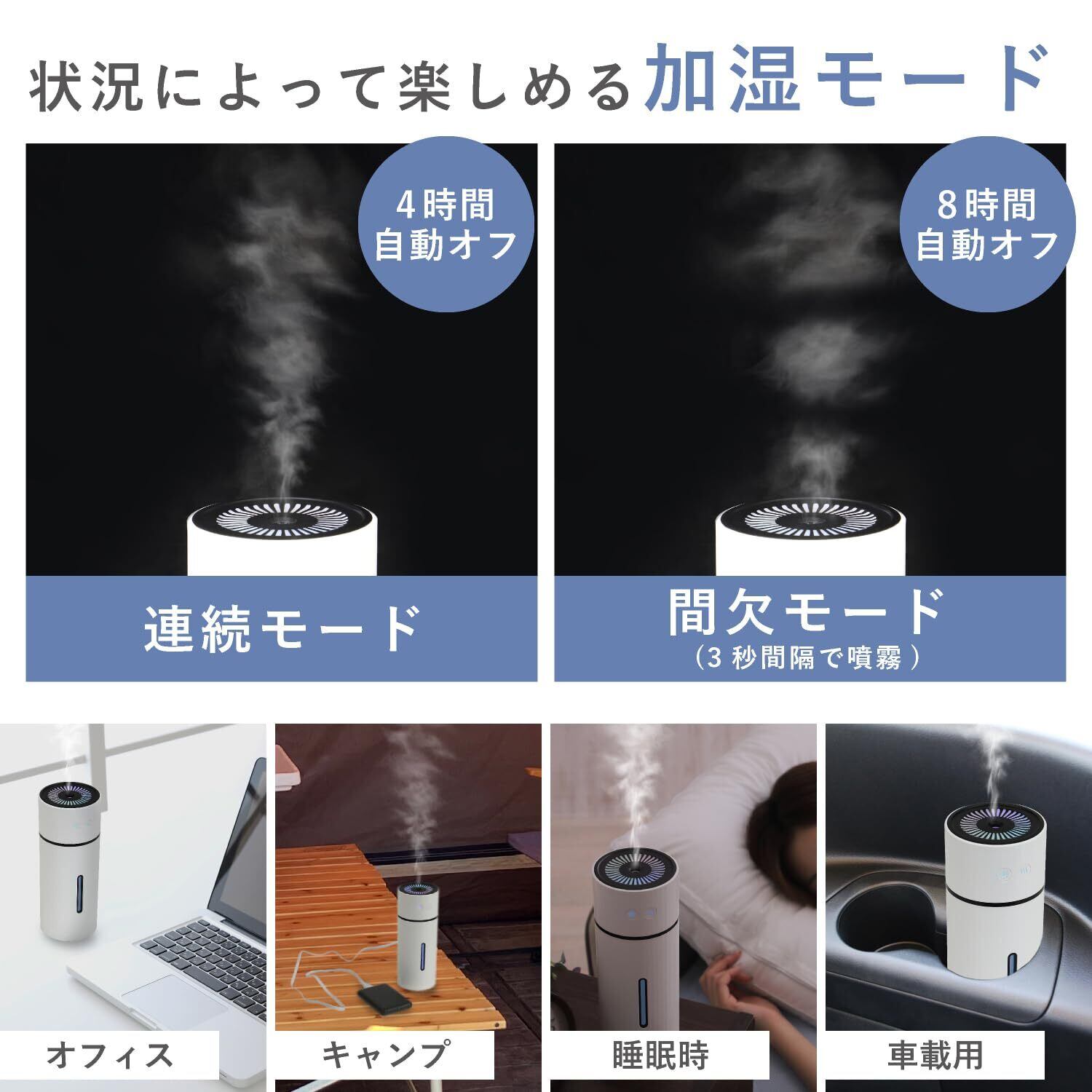 【加湿器 小型 &USB電源】ペットボトル型で、7.2cm x 7.2cm x 18.5cmのコンパクトサイズで、 加湿器 寝室 ・オフィスでの使用はもちろん、 車載加湿器 として移動中の使用や、 アウトドアや外出先でもスマートに潤う!USB給電式ですのでモバイルバッテリー、PC、車載シガーソケット等のUSB電源から電源を取れるので、利便性が高く、どこでも使える加湿器 です。