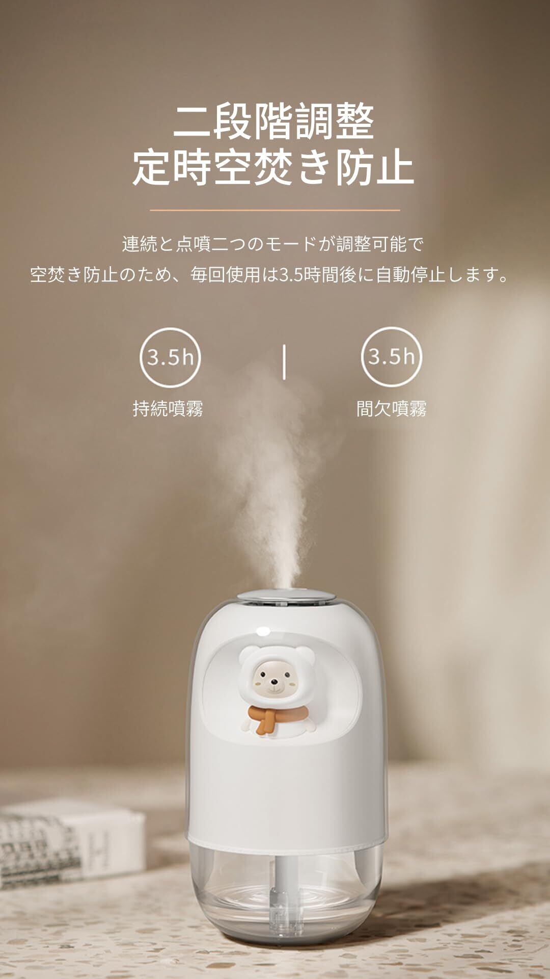 【間欠噴霧調整、定時で空焚き防止】小型加湿器は連続と点噴二つのモードが調整可能で、スイッチを入れば、連続噴霧モードで起動、もう一回押しは点噴で5秒ごとに噴霧します。空焚き防止のため、毎回使用は3.5時間後に自動停止します、水切れの空焚きは心配不用です。加湿器から出るミストは熱くない、安全なミストだからやけどの心配はありませんが、お子さんやペットがいる家庭でも、ご安心して利用できます。