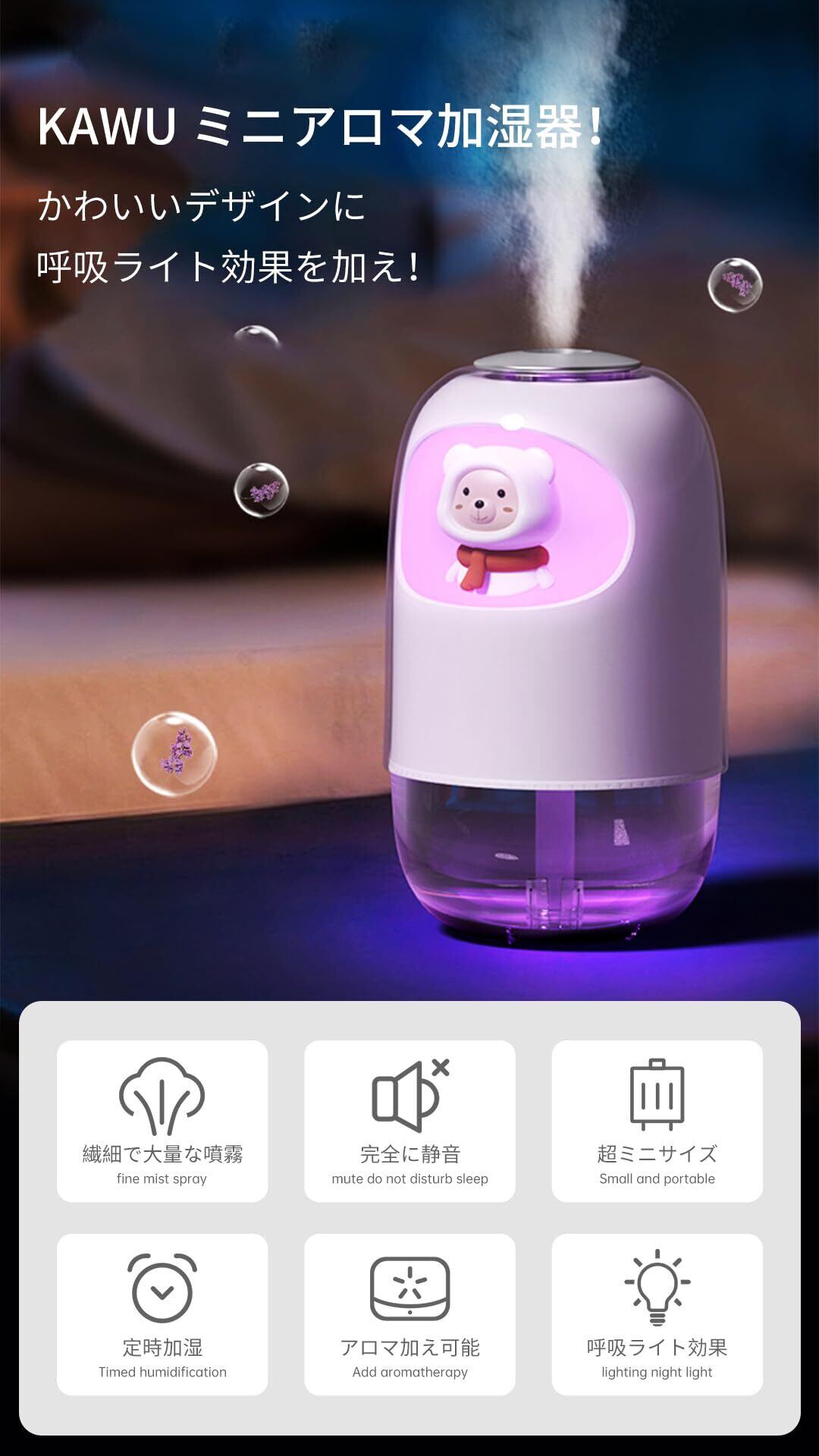 KAWU 25年最新 ミニ卓上加湿器 アロマディフューザー アロマ対応 小型 静音 省エネ 卓上型 空焚き防止 LED暖白ライト 約2-10畳対応 お手入れ簡単 寝室・部屋・オフィス用 乾燥対策 ギフトにも最適