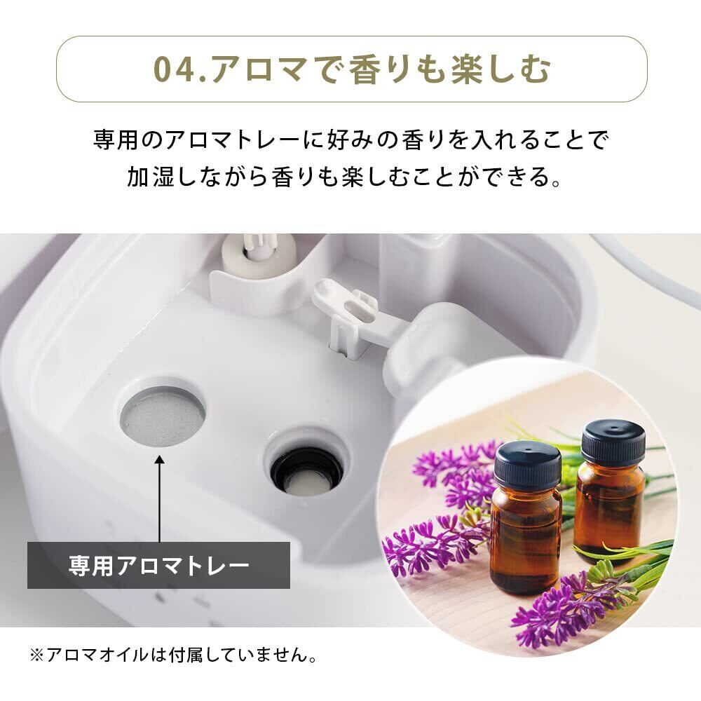 消費電力:超音波25W/ヒーター130W、ヒーター:超音波振動板、ミスト量:強/中/弱、AG+抗菌:SIAAマーク取得、適用床面積:約5畳(木造)、約8畳(プレハブ)、タンク容量:4.0L、電源コード長さ:約1.5m