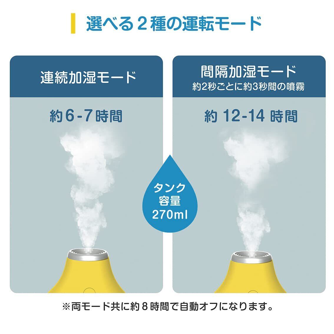 【製品特徴】連続加湿モード(約6-7時間)、間隔加湿モード(約12-14時間)、自動停止機能搭載(約8時間)、USBケーブル(同梱)でモバイルバッテリーやパソコン給電可能、※バッテリー非搭載、※アロマオイル、アロマウォーター使用不可