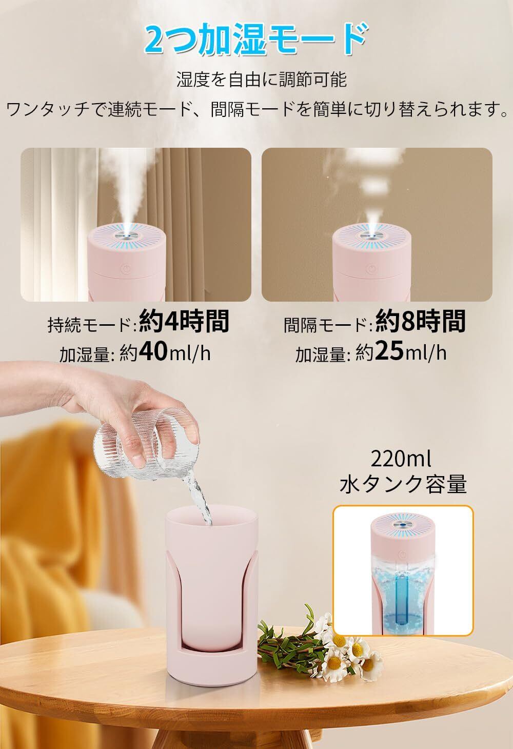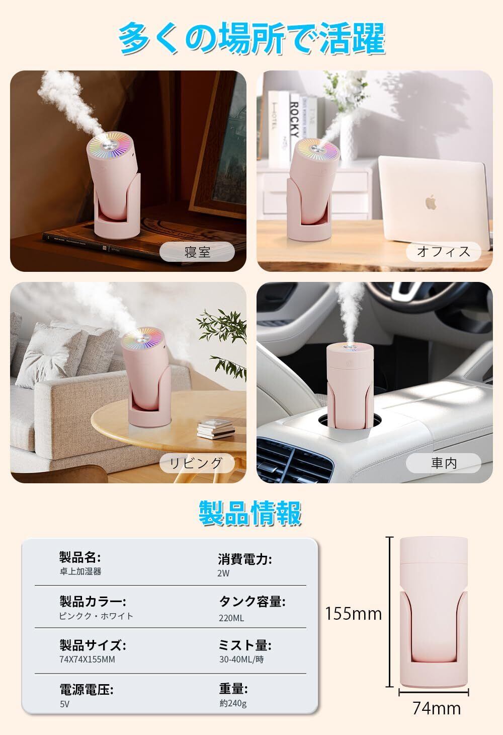 加湿器 小型 卓上 大容量220ML アロマ対応 次亜塩素酸水対応 2段階ミスト 7色LEDライト 静音 USB給電式 上下角度調整 車載加湿器 持ち運び便利 軽量 空焚き防止 水漏れ防止 省エネ 6畳 乾燥/花粉症対策 車用 寝室/部屋/家庭用