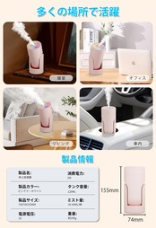 【静音設計&持ち運び便利な車載加湿器】この車載加湿器は静音設計が施されており、就寝中や仕事中でも気になることなく使用できます。お部屋の空気を清潔に保ちながら、快適な湿度を維持しますので、安心してご使用いただけます。小型加湿器は直径74mmのサイズで車載用のドリンクホルダーに入るように設計されています。厚みもなく、かばんに入れやすいサイズなので持ち運びにも最適です。リビングルーム、寝室、書斎、車などの場所でも安心して使用できる加湿器です。