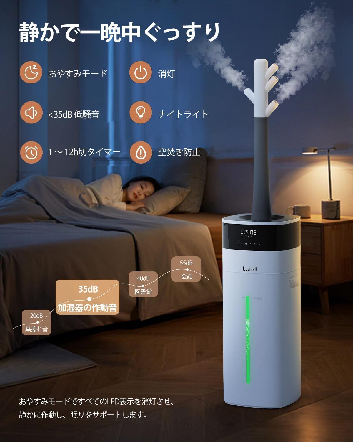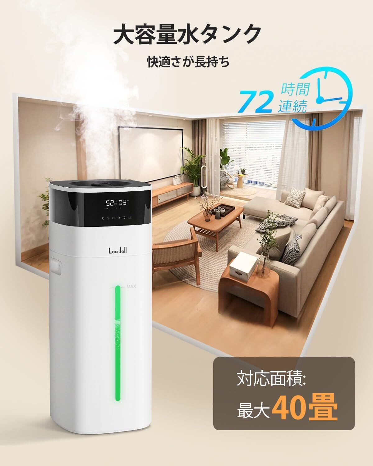 【20L 大容量加湿器・加熱式加湿器】LACIDOLL 加湿器はハイブリッド式で、加熱式と超音波式を組み合わせた設計により、一年を通して快適にご使用いただけます。乾燥した季節には、超音波式で冷たいミストを放出し、室温に影響を与えずに加湿できます。寒い冬には、加熱ボタンを押すと内蔵 PTC ヒーターが水を加熱し、水蒸気に変えて、超音波で生み出す冷たいミストと混ぜてミストを温かくします。吹き出し口から噴出する蒸気は火傷に及ばず温かいので、お子様やペットのいるご家庭でも安心してお使いいただける設計です。20L の大容量加湿器は、最大 72 時間の連続運転が可能で、40 畳までの広い空間をしっかりと加湿できます。頻繁な給水が不要で、就寝時や忙しい時でも安心して使用できます。
