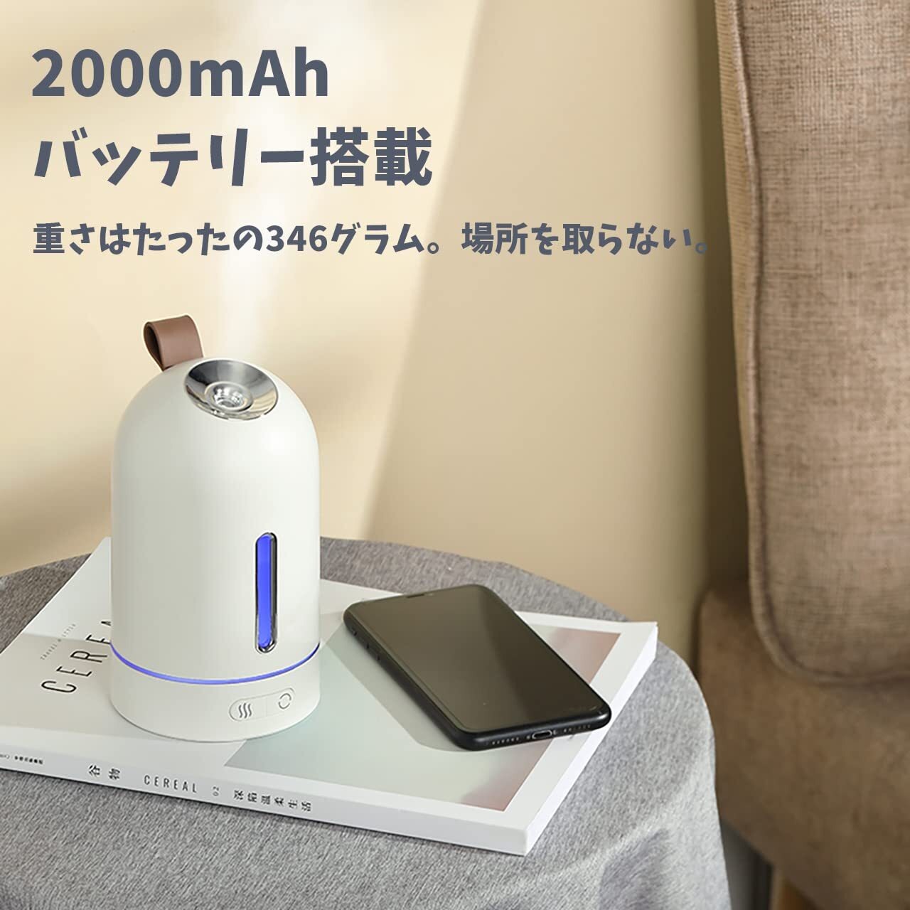 【 ストラップ付き 】本体に持ちやすい可愛いストラップが付いているので、持ち運びにとても便利です。小型なので寝室からデスク、オフィス空間や車などでの移動がとても楽です。