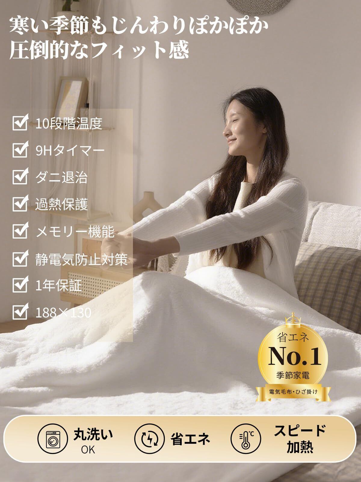 安全性へのこだわり・何よりも安全性を第一に。①電気毛布部分は洗たく機で丸洗える可能、清潔さを保つのが簡単。②抗菌防臭加工を施し、高温設定時にはダニ退治も可能で清潔感にこだわる方にも最適。③タイマーは自動OFFが基本。消し忘れの心配がなく、デフォルト3Hで使用と節電にも安心。④PTCパッシブ温度制御、過圧保護、阻燃保護、均一加熱により安心して心地よい睡眠をサポート。⑤電気ひざ掛けは静電気防止対策を強化。パチパチしない使い心地で、冬の快適さをアップ、寒い冬の重宝。⑥PSE認証取得済み。