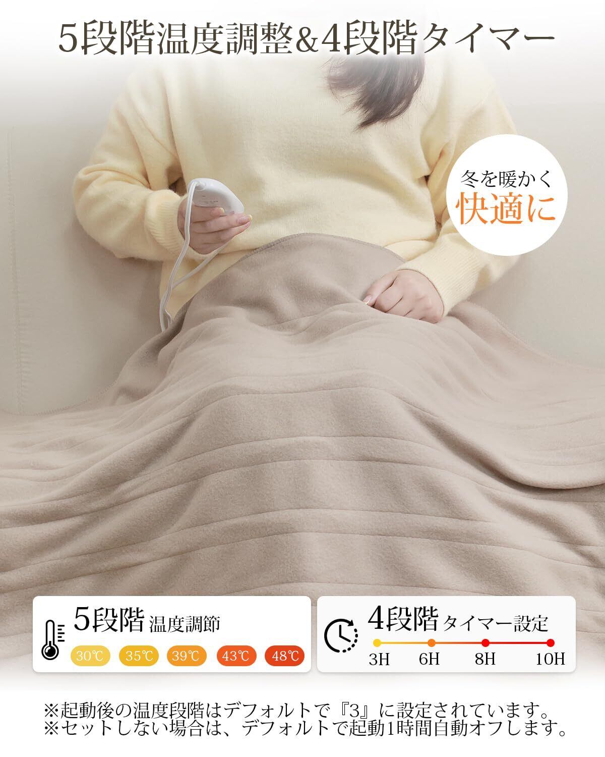 【寒い冬場の就寝時も快適に】この電気毛布敷きは寒い季節に冷えたベッド・ふとんや身体をぽかぽかにあたため、心地よい眠りに導いてくれる電気毛布。フローリングや畳からの底冷えもしっかりシャットアウトします。ひざに掛けても、肩からかけてもゆったり使える厚手生地な電気ひざ掛け。掛け敷き兼用で場所を選ばずご使用頂けます。プレゼントにもおすすめです。 ※注意: 1.発熱線が重なった状態は温度が高くなり、長時間お体に触れていると火傷を起こす可能性がございます。必ず電気毛布本体を広げた状態でご使用ください。 2.電源ボタンを長押し (2~3秒) して、コントローラーの電源をON/OFFにします。 万が一電気毛布掛けに不具合があった場合やご満足いただけなかった場合はお手数お掛けしますが、注文番号を添えての購入履歴よりまでご連絡ください。