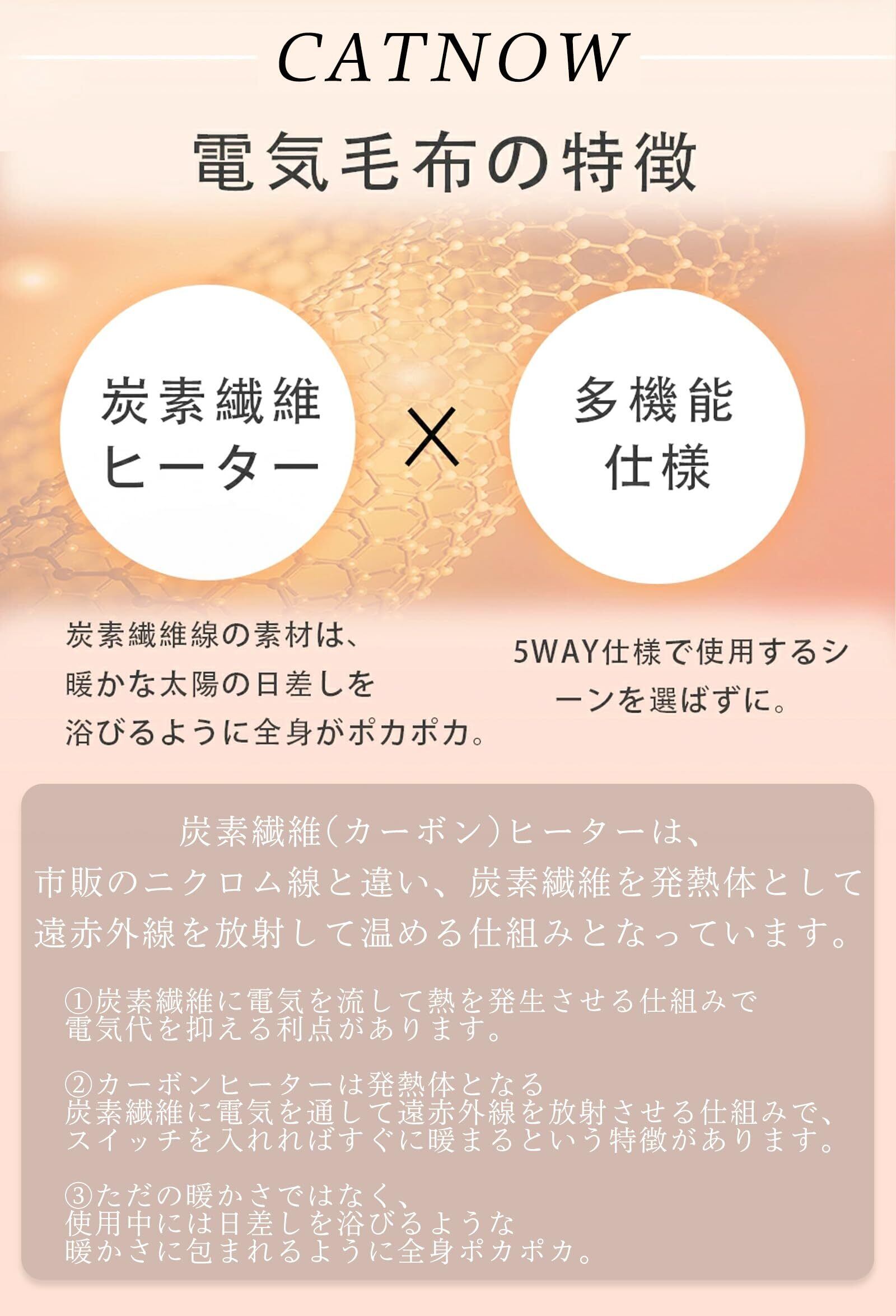 【最新の炭素繊維発熱線】内部には最新技術の炭素繊維発熱線が採用されており、優れた耐熱性と効率的な熱伝導を実現しています。これにより、まるで日光浴をしているかのような、自然で心地よい温かさを体感できます。また、消費電力が抑えられているため、省エネ効果も期待できます。安全性も高く、寒い季節に安心して長時間使用できる電熱毛布です。