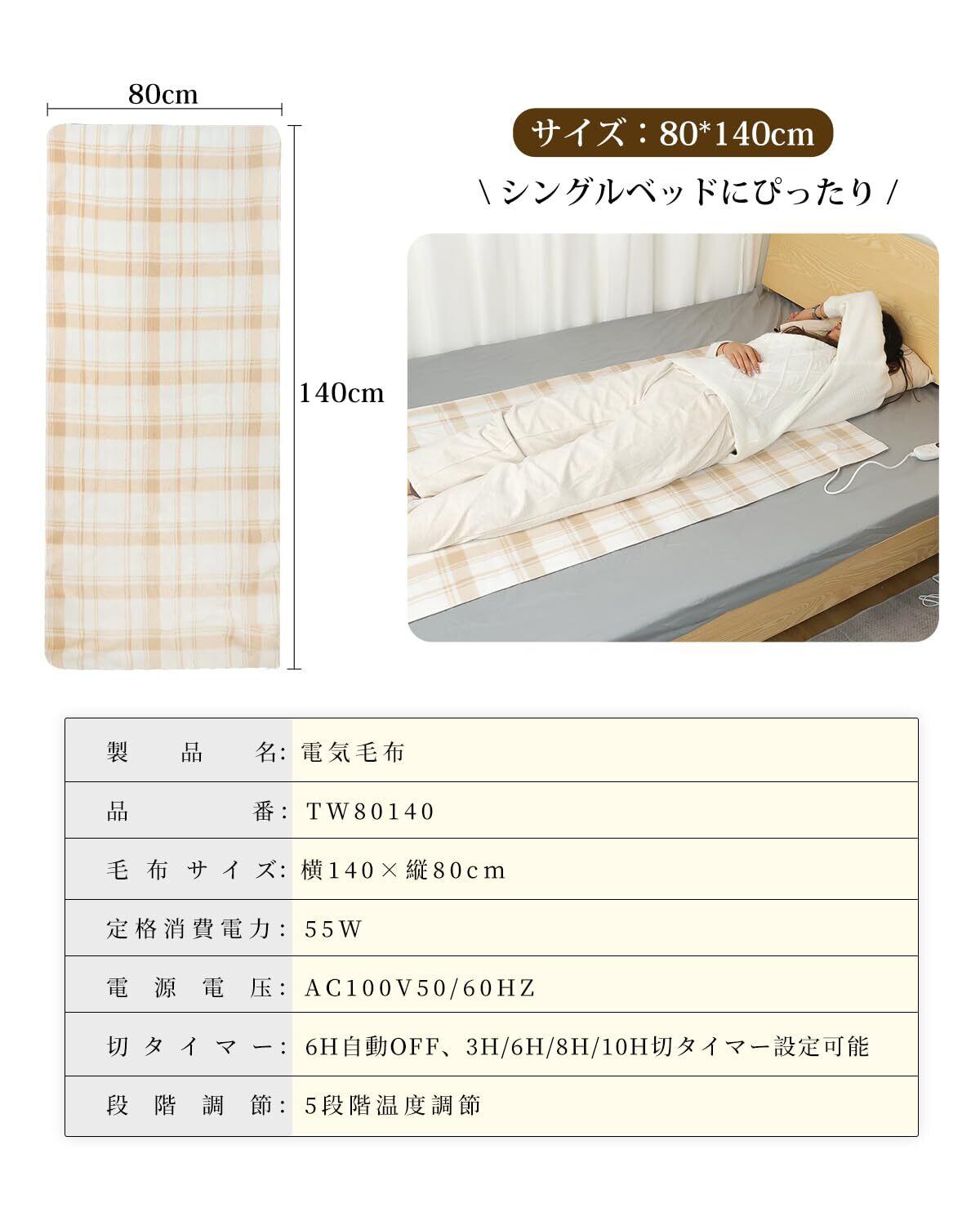 【いろんな場所で大活躍電気毛布】電気毛布は敷き毛布として、ソファや布団に敷くのはもちろん、ひざや肩に掛けても使えます。140cm×80cmのワンサイズなのに十分な暖かさ、一人用としてたっぷり使えます。この1枚で身体を温めて快適睡眠、冷え性に悩む方におすすめします。