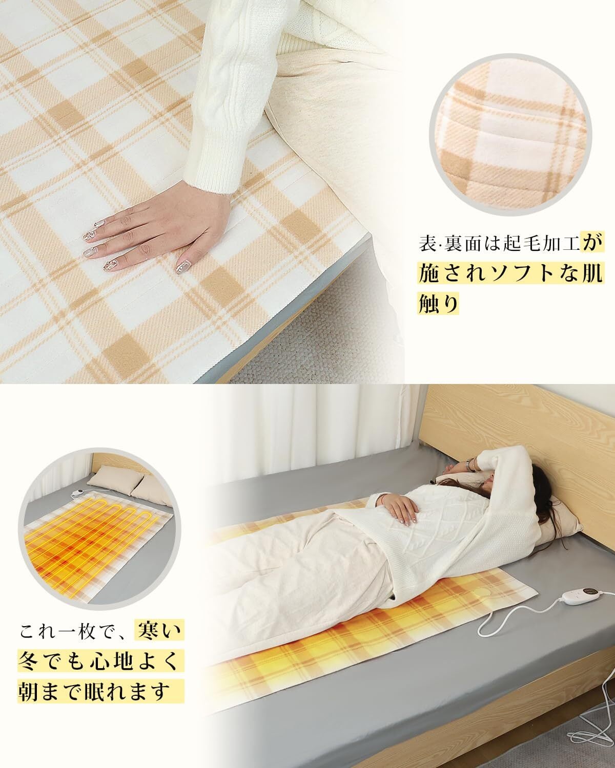 【使いやすい敷き電気毛布・軽くて柔らかい生地】お布団が寒くて眠れない夜に、この敷き電気毛布はベツドに敷く、就寝15~30分前に予熱して、朝までぽかぽか、心地よい眠りを実現します。さらにふわふわした触り心地のポリエステルを使用し、表・裏面は起毛加工が施され、軽くやわらかい肌触りなので、重い毛布が苦手な方や持ち出して使いたい方におすすめです。