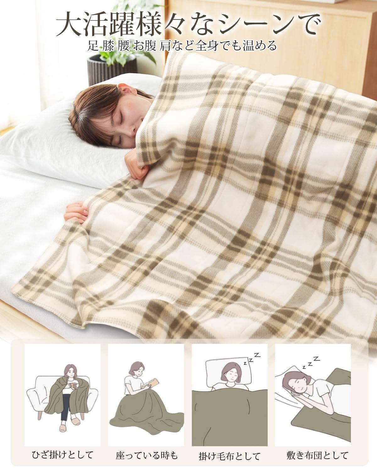 【寒い冬場の就寝時も快適に】この電気毛布敷きは寒い季節に冷えたベッド・ふとんや身体をぽかぽかにあたため、心地よい眠りに導いてくれる電気毛布。フローリングや畳からの底冷えもしっかりシャットアウトします。ひざに掛けても、肩からかけてもゆったり使える厚手生地な電気ひざ掛け。掛け敷き兼用で場所を選ばずご使用頂けます。プレゼントにもおすすめです。 ※注意: 1.発熱線が重なった状態は温度が高くなり、長時間お体に触れていると火傷を起こす可能性がございます。必ず電気毛布本体を広げた状態でご使用ください。 2.電源ボタンを長押し (2~3秒) して、コントローラーの電源をON/OFFにします。