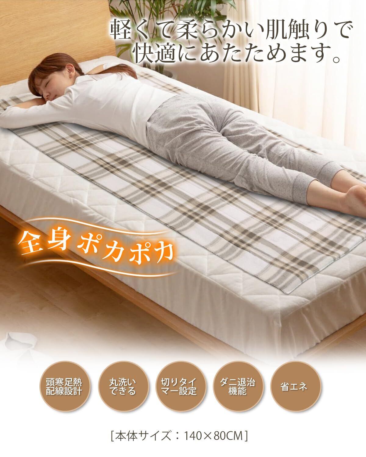 【優れた保温性・毛玉ができにくい素材】電気毛布は暖かみのある両面チェック柄を採用。ふんわりと包み込んでくれるような生地で、すぐじんわりと暖かくなります。優れた縫製技術のおかけで、極細繊維がちゃんと詰まっていて、肌触りだけでなく、毛玉ができにくい素材、高い保温性と耐久性を兼ね揃えます。寒い季節に冷えたベッド・ふとんや身体をぽかぽかにあたため、心地よい眠りに導いてくれる電気毛布。