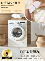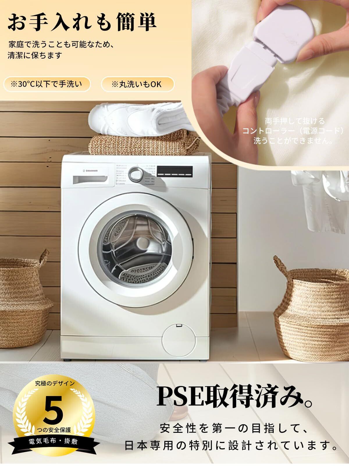 安全性へのこだわり・何よりも安全性を第一に。①電気毛布部分は洗たく機で丸洗える可能、清潔さを保つのが簡単。②抗菌防臭加工を施し、高温設定時にはダニ退治も可能で清潔感にこだわる方にも最適。③タイマーは自動OFFが基本。消し忘れの心配がなく、デフォルト3Hで使用と節電にも安心。④PTCパッシブ温度制御、過圧保護、阻燃保護、均一加熱により安心して心地よい睡眠をサポート。⑤電気ひざ掛けは静電気防止対策を強化。パチパチしない使い心地で、冬の快適さをアップ、寒い冬の重宝。⑥PSE認証取得済み。