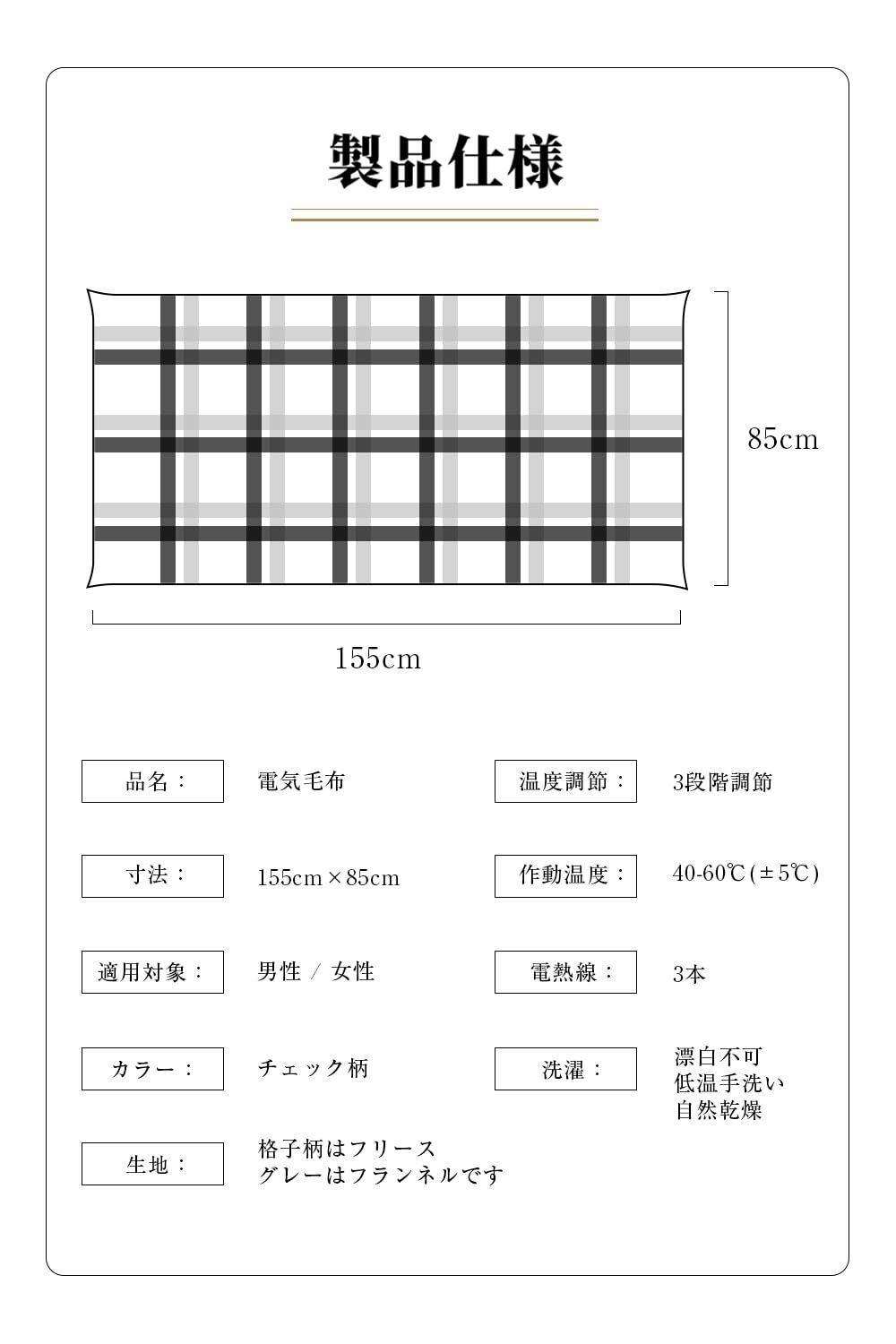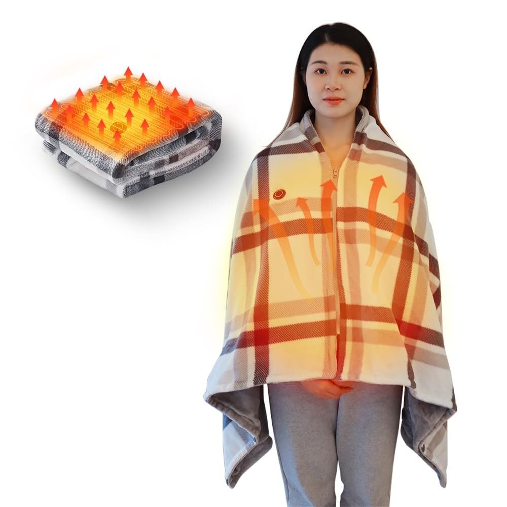 明誠 電気毛布 ひざ掛け USB給電 ヒーターブランケット 155×85cm 肩掛け毛布 電気敷き毛布 モバイルバッテリー給電 三段階温度調節 ファスナー付き ポケット付き 洗い可能 冷え予防 (チェック柄)