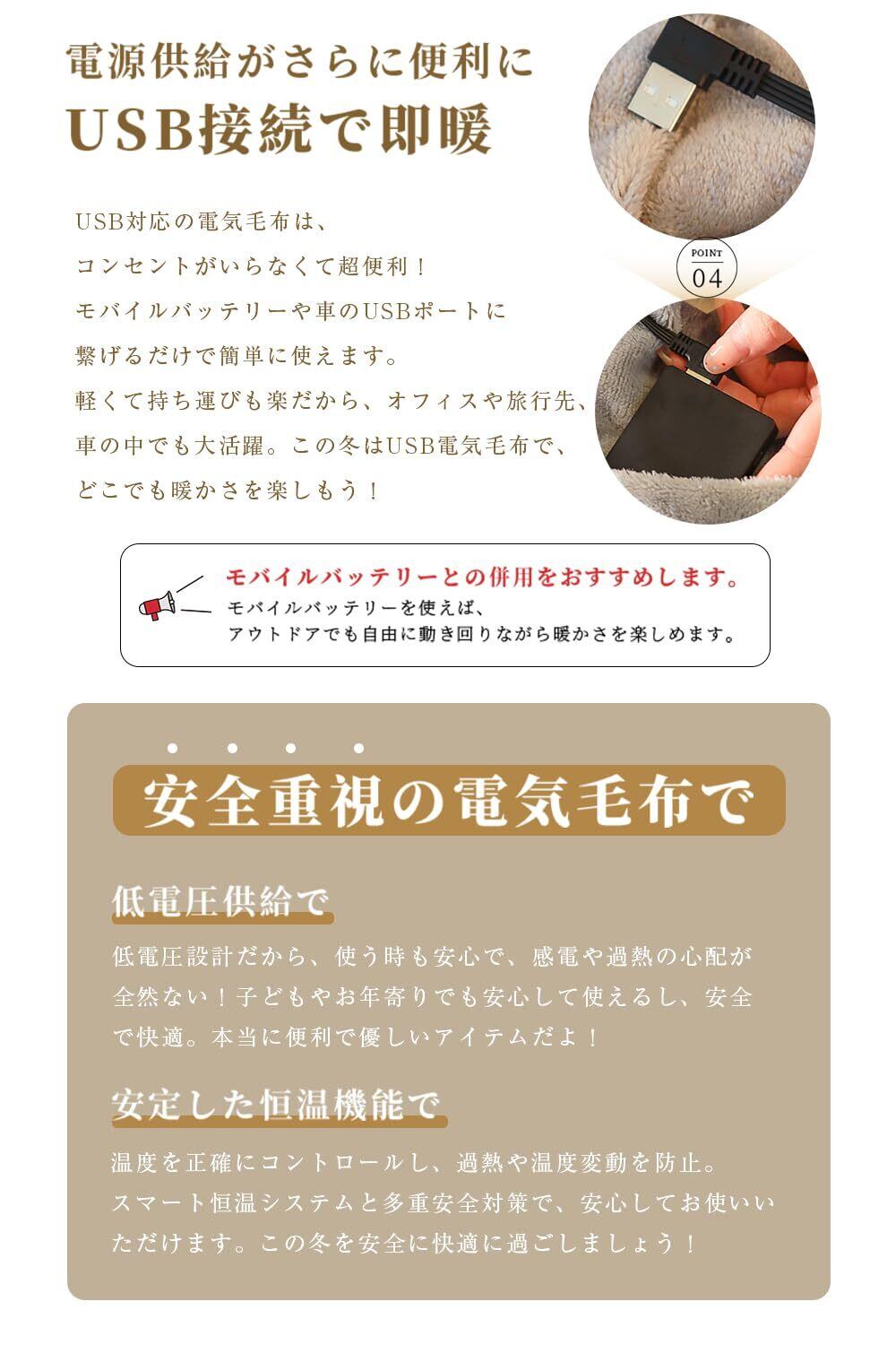 USB給電式の電気毛布は、アダプターやパソコン、カーチャージャーのUSBポートから給電できるのでとても便利です。また、コードレスで使えるため取り回しがよいのもメリットです。USBポートが設けられたポータブル充電器(モバイルバッテリー)などから給電することが可能。車内泊やオフィスなどで使用したい方におすすめです。
