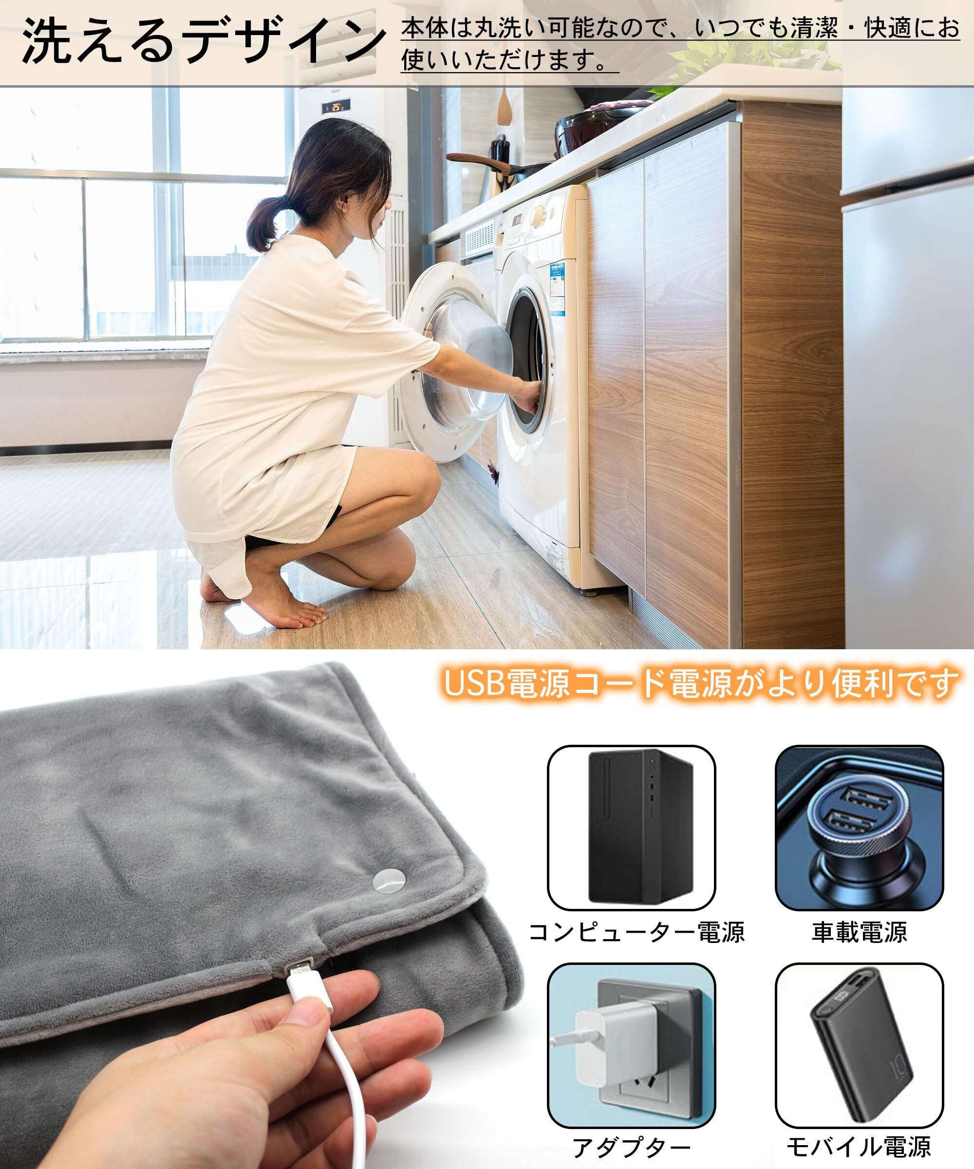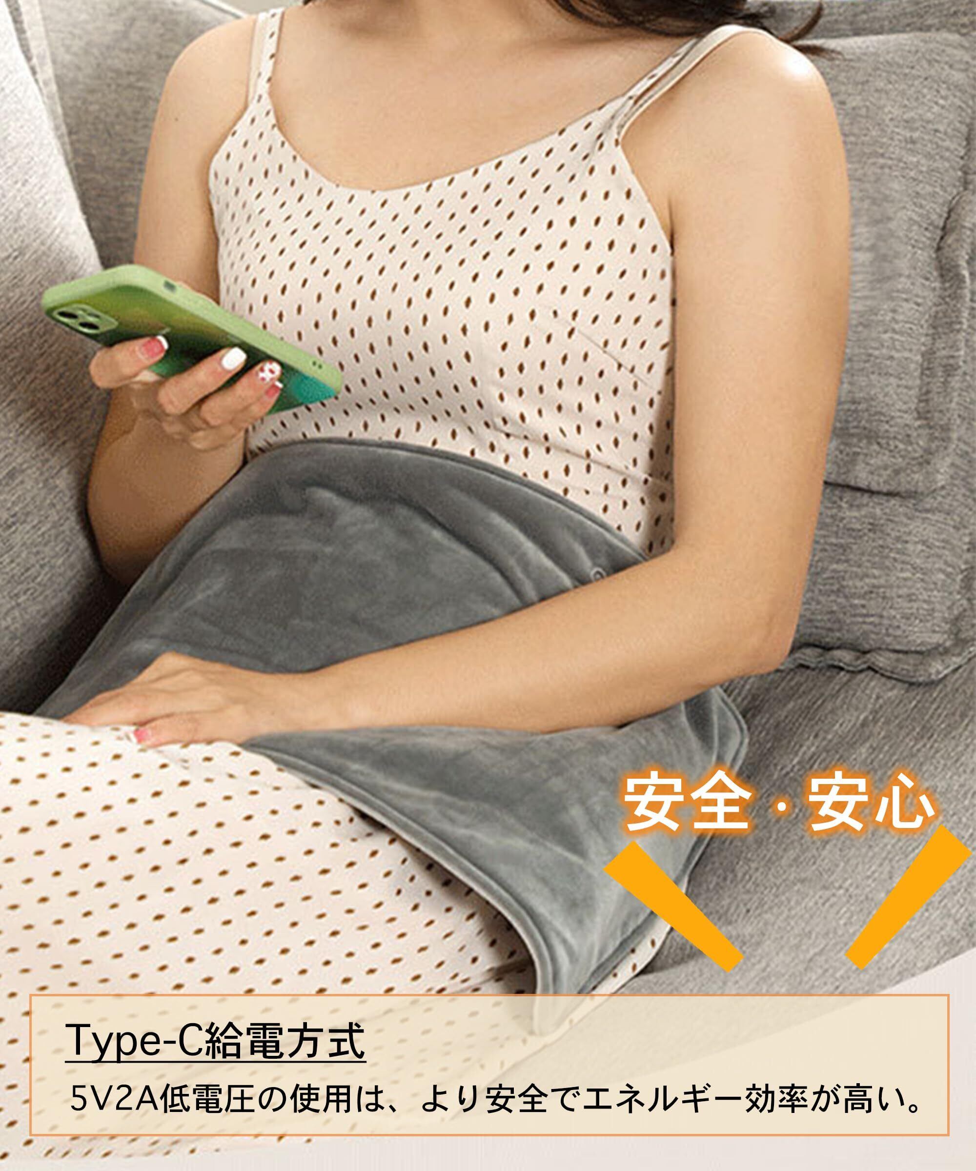 【便利で省エネのUSB Type-C給電方式】こちらのヒーターにはUSB Type-C給電方式を採用しています。そのため、ノートパソコン、モバイルバッテリー、またはUSBアダプターからでもヒートパッドに電力を供給することができます。フレキシブルな給電方法を採用しており、自宅だけでなく、外出先や屋外でもお使いいただけます。省エネ効果に優れたUSB電気毛布で、1時間あたりの消費電力は10W。