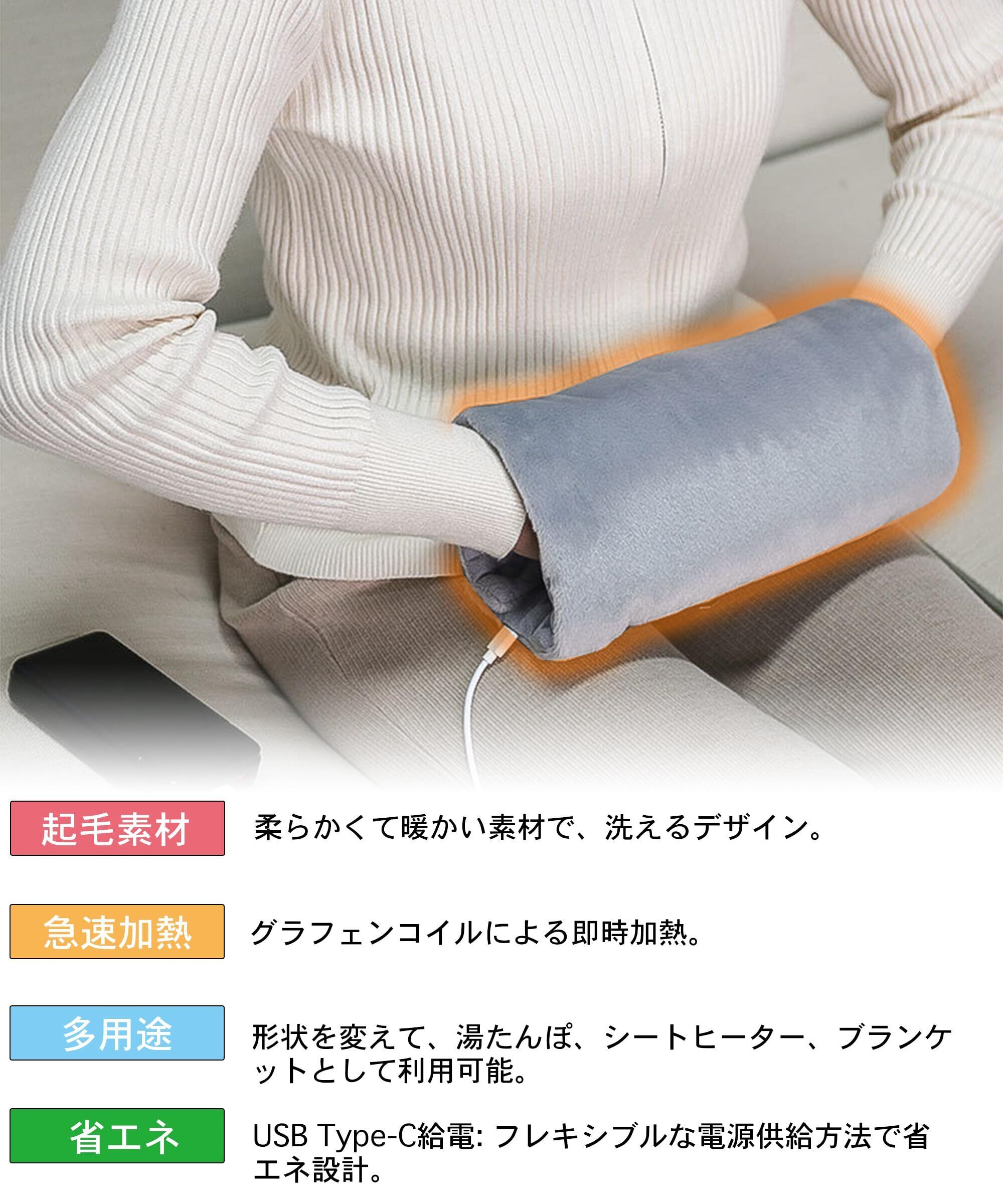 【高熱伝導素材、10秒で急速加熱】当社のホットマットは熱伝導性に優れたグラフェンコイルを広範囲に採用しており、電源につなぐと、10秒以内に素早く発熱し、長時間暖かさを保ちます。水を入れたり充電したりする必要がなく、プラグを差し込むだけで発熱します。湯たんぽのように水漏れの心配もなく、一日中暖かく過ごせます。