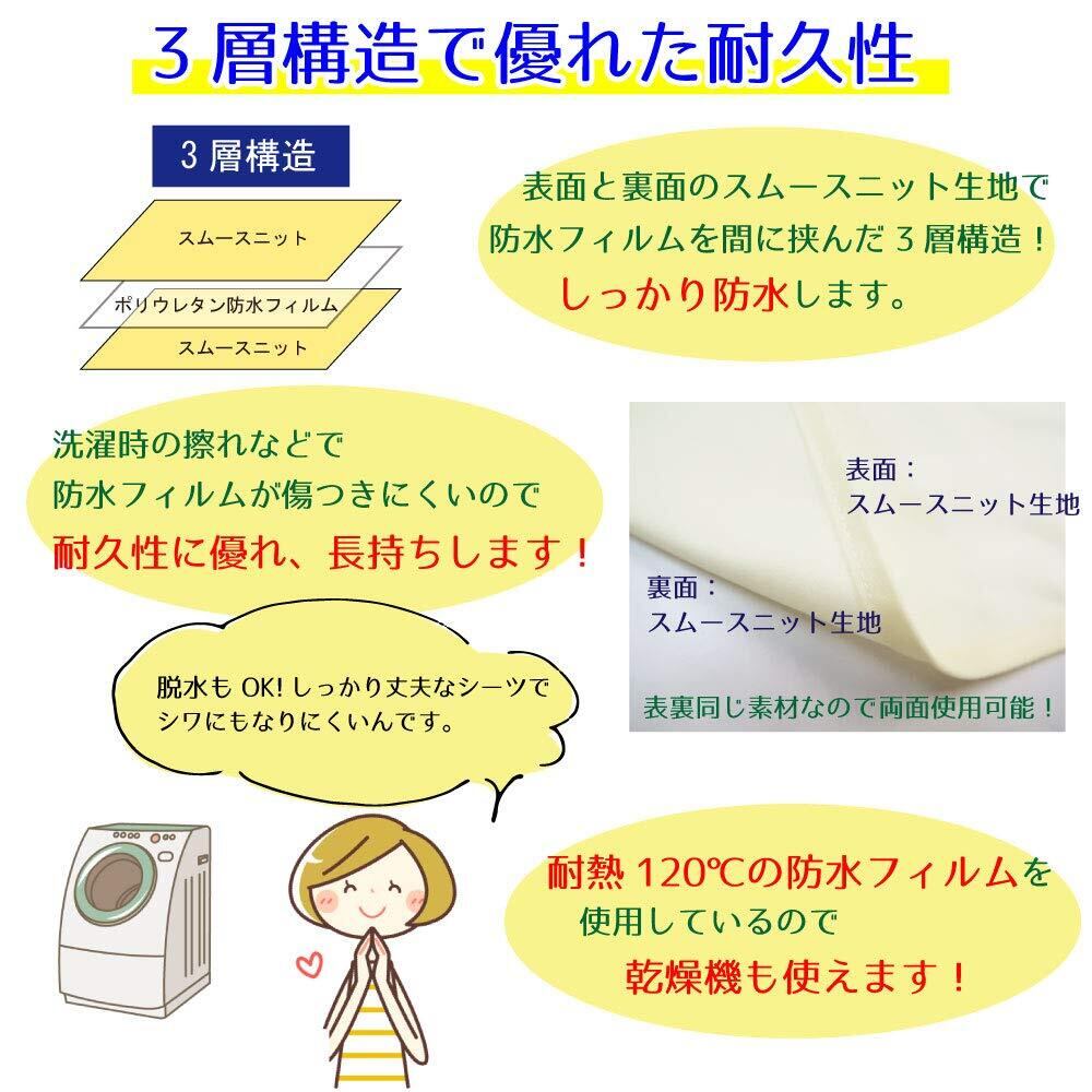 しなやかで、伸縮性のあるスムースニットで防水のポリウレタンラミネートをサンドイッチした3層構造。ベッドやお布団を濡らしません。四隅ゴム付で着脱もらくらく! 耐久性に優れ、シワにもなりにくくよれにくい取り扱いしやすい防水シーツです。