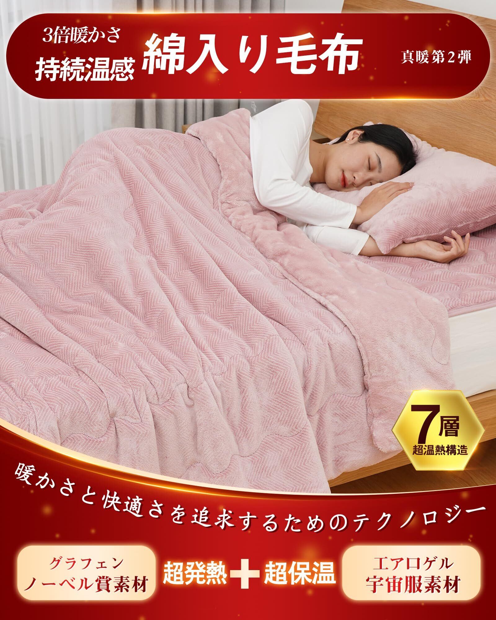 独自開発!温をよく循環させる7層温熱キープ構造で熱を創り・蓄え・逃さない 冬用高機能厚手毛布。『高密度フランネル表地 ➡ 超断熱「エアロゲル」中綿(断熱層) ➡蓄熱保温「炭素繊維」中綿(蓄熱層)➡ ➡中空纤维(空気層保温)➡遠赤外線「グラフェン」中綿(発熱・蓄熱層) ➡「帝人繊維+アクリル」中綿(吸湿発熱抗菌除臭層)➡高密度フランネル裏地』の特殊設計。吸湿発熱・遠赤外線・蓄熱・断熱の各機能が連携し、体温を効率的に創出・蓄積・保持。外気の冷たさを遮断し、冬の寒い夜も朝までぽかぽかの「あったか」を持続させる毛布 です。