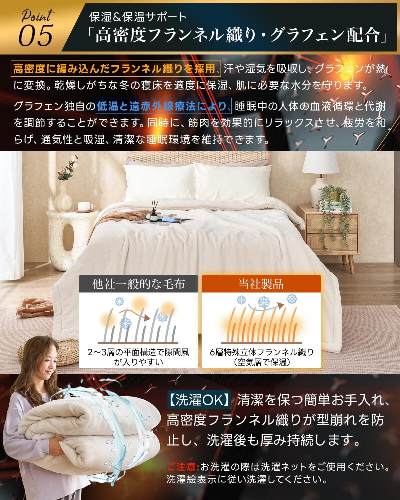 【二枚合わせ毛布・丸洗いOK】高密度フランネル二枚合わせ毛布、通常2枚重ねて使う厚みを1枚で実現し、圧倒的な保温性を持ちながら、通気性と軽さも両立。日本特有の隙間風対策として、15cm幅の襟り付き。布団のすき間から入る冷気をシャットアウトし、就寝中の体温低下を防ぎます。清潔を保つ簡単お手入れ、高密度フランネル織りが型崩れを防止し、洗濯後も厚み持続します。 ご注意:お洗濯の際は洗濯ネットをご使用ください。洗濯絵表示に従い洗濯してください。