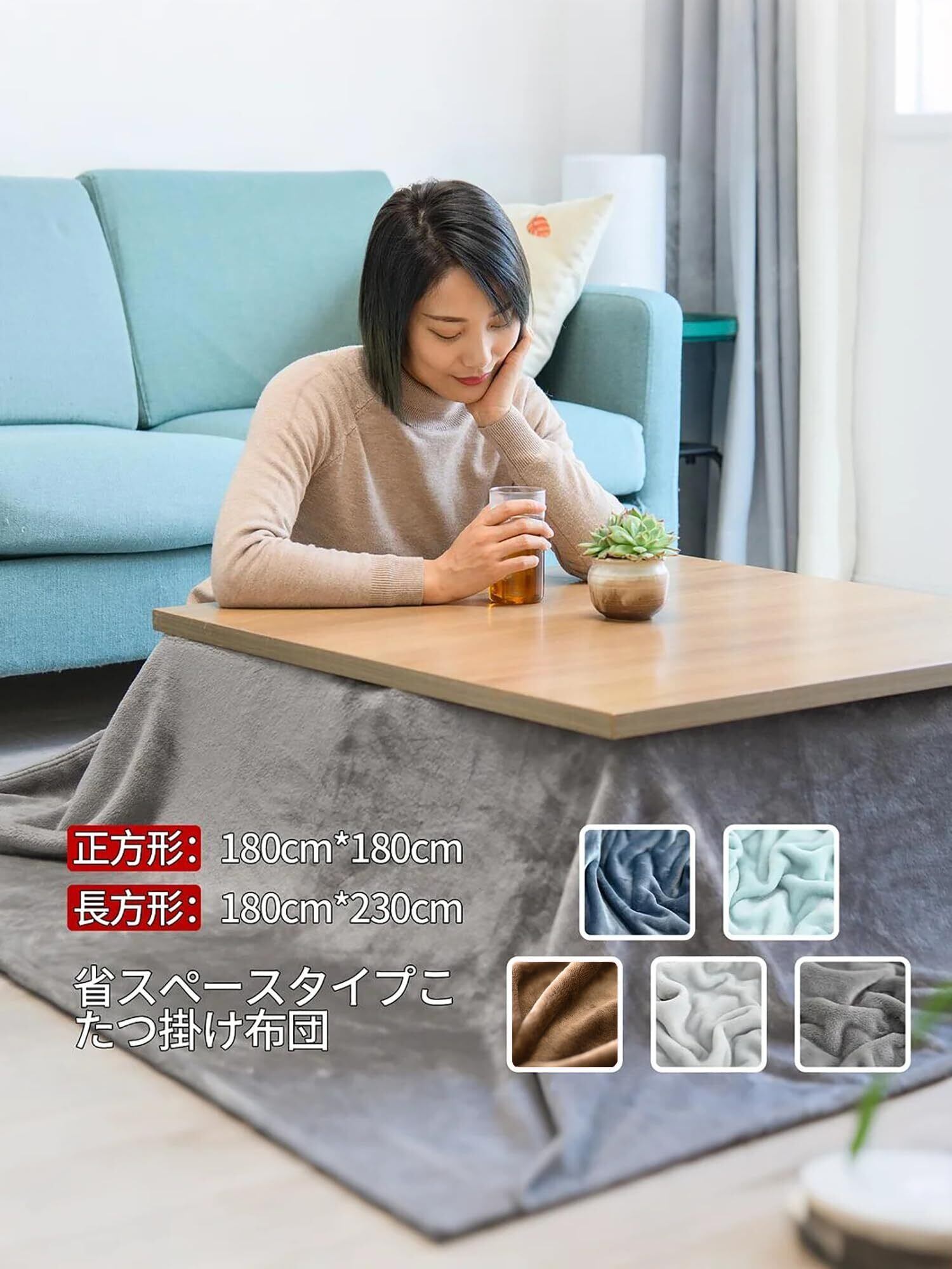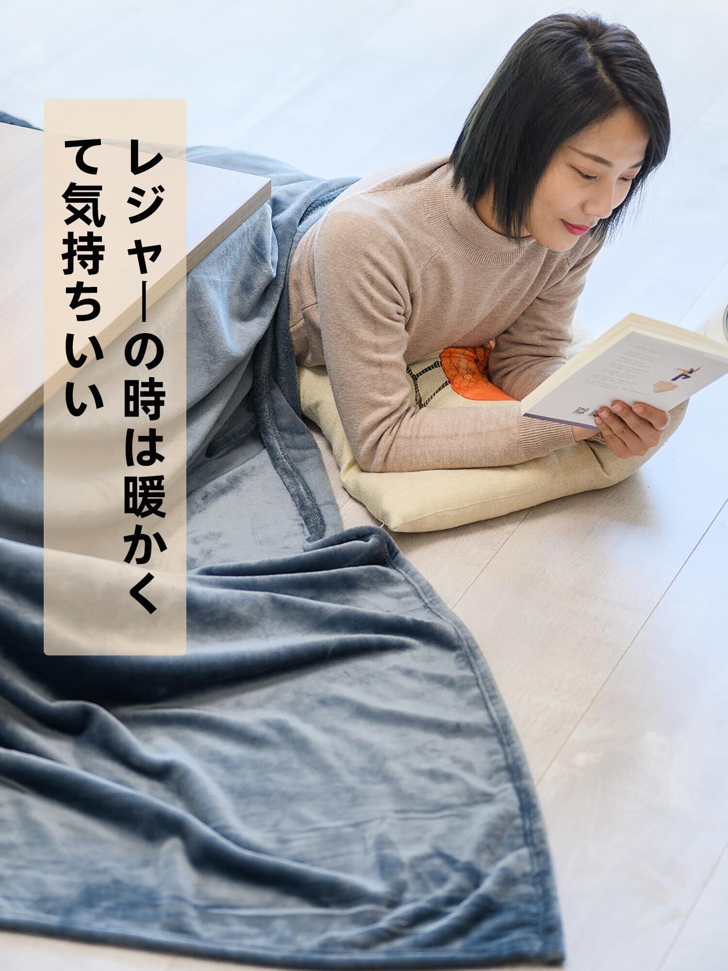 【軽量・省スペースデザイン】標準型のこたつ布団に比べ、見た目スッキリです。こたつ中掛け毛布は軽量で薄いため、持ち運びや収納がしやすく、こたつ掛け布団と重ねたご使用に適しています。