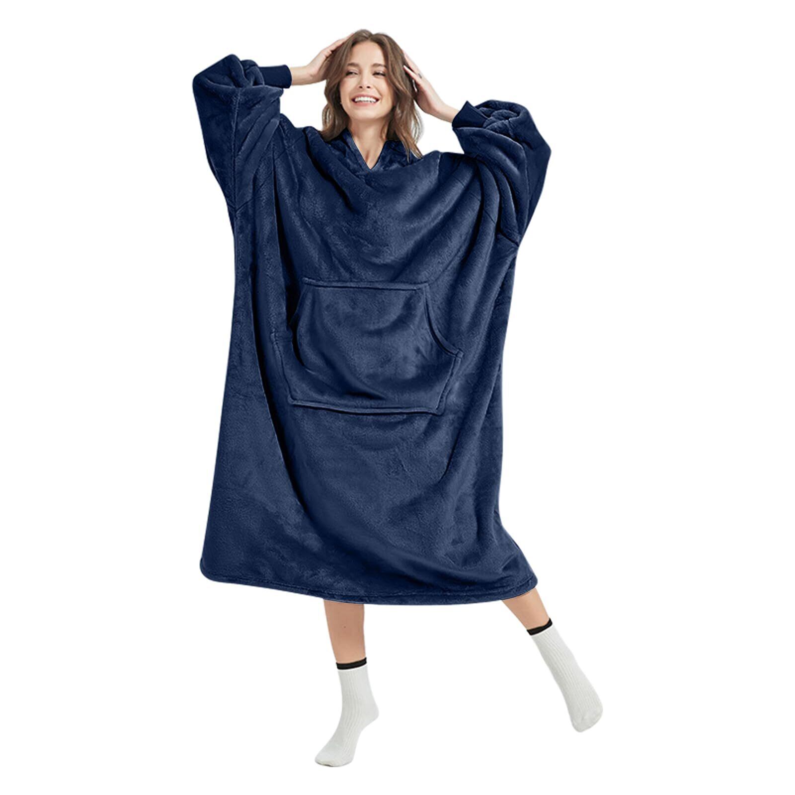 BLACK BADGER 着る毛布 レディース 男女兼用 かいまき フード付き ロング丈 ルームウェア プレミアムマイクロファイバー 袖口ゴム仕様 家事がしやすい 静電気防止 洗濯機洗い可 (ネイビーブルー・フリーサイズ)