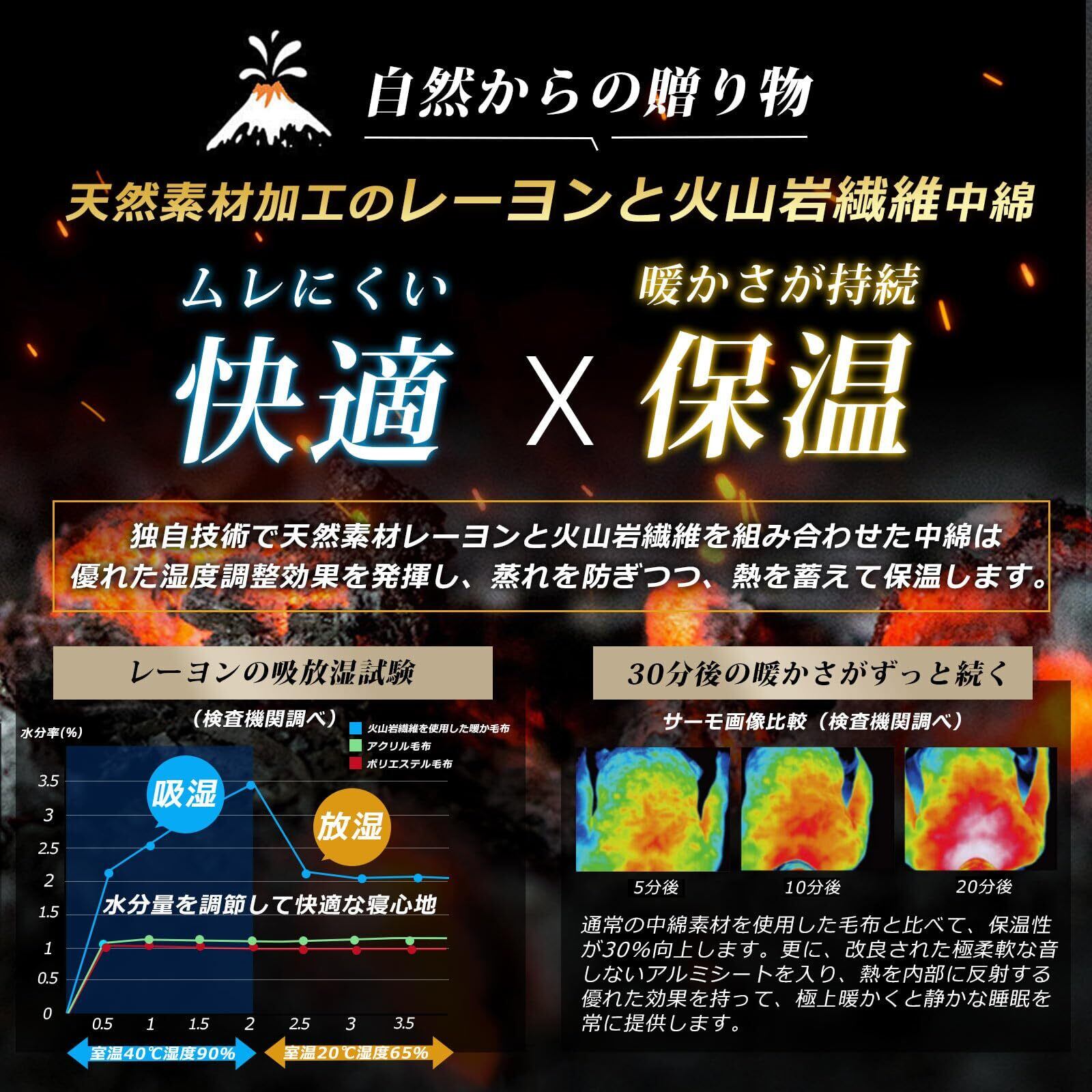 【驚く吸湿発熱力と蓄熱保温力の秘密:レーヨン&火山石入り中綿】毛布の中綿は、レーヨンと火山岩繊維の混合素材で作られています。レーヨンは天然素材で、体から放出される湿気を素早く吸収し、熱に変える一方、火山岩繊維はその熱を捕らえ、毛布内にしっかりと閉じ込めます。通常の中綿素材を使用した毛布と比べて、保温性が30%向上します。二つの素材の上手に組み合わせにより、毛布の湿度の調整効果を最大に発揮し、蒸れを防ぎつつ、熱を蓄えて保温できます。極上の快適さと暖かさを持続的に提供する高級毛布です。