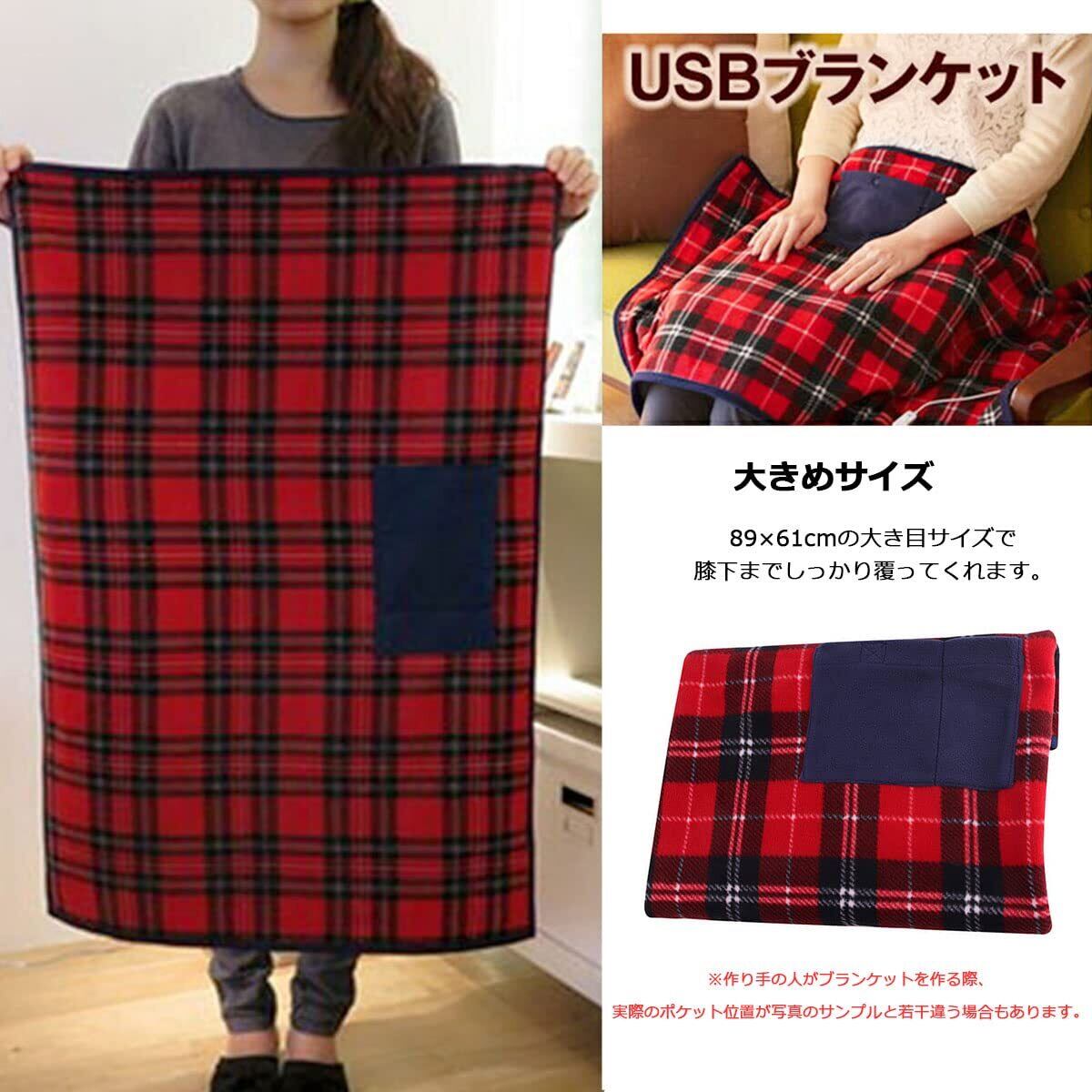 USB ブランケット 電気毛布 ひざ掛け 洗える 電気ひざ掛け 毛布 usb給電 USBヒーター ホットブランケット オフィス アウトドア キャンプ 防寒 省エネ 電気ブランケット 89×61cm チェック柄 (レッド)