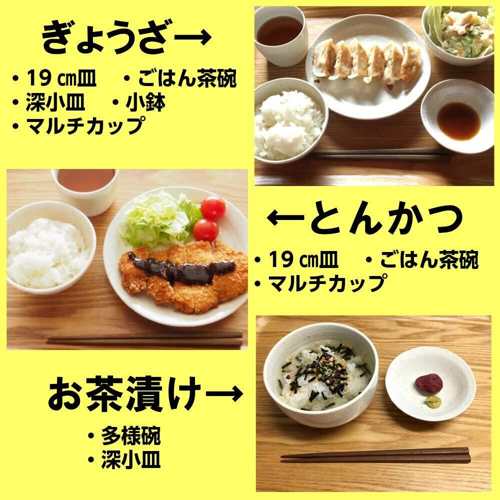 商品サイズ:ごはん茶碗-約12×6cm,深小皿-約11.5×3.5cm,小鉢-約13.3×5.5cm,マルチカップ-約8.5×6.7cm,16cm皿-約16.6×2.4cm,19cm皿-約19.2×2.7cm,多様丼-約13×7.8cm,カレー&パスタ皿-約22×H4.8cm,ラーメン鉢-約19×H8cm,箸(中国製)-約22.5cm
