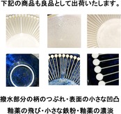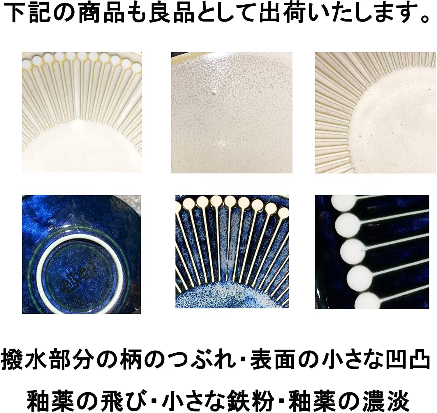 同じ土、技法、釉薬を使用しても、焼成時の窯での火の当たり加減、その日の天候や湿度などの影響によって色合いが常に変化するため、焼き物は生き物だといわれます。窯変による色の濃淡や、撥水で描かれる柄の出具合などには個体差があり、釉薬の滲みやたれ、ハゲ、ゆがみ、鉄粉やピンホールなどが見られる場合もございますが、器の持つ個性や味わい深さとしてご理解いただき、一つ一つ異なる器との出会いをお楽しみいただけましたら幸いです。