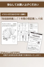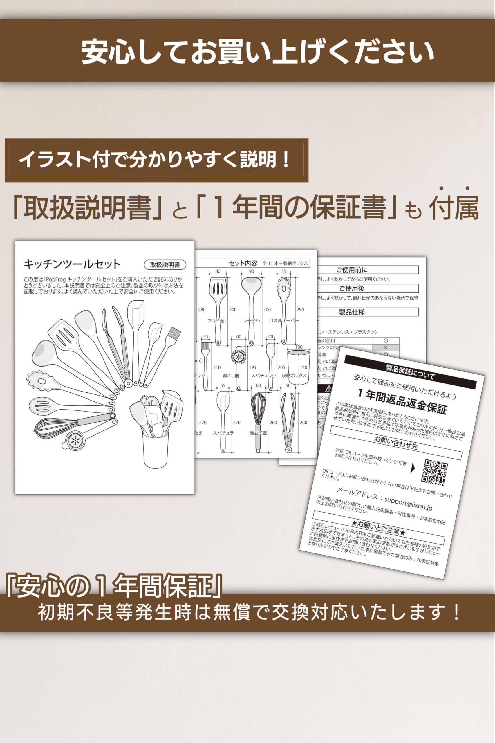 【内容】収納BOX、小スパチュラ、穴あきスプーン、パスタサーバー、トング、泡たて器、シリコンブラシ、大スパチュラ、レードル、ターナー、スプーン