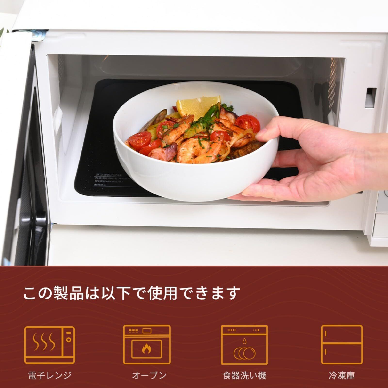 便利な使い勝手: 白いボウルは、電子レンジやオーブン、食器洗い機、冷凍庫に対応しており、加熱や洗浄が簡単で便利です。また、重ねて収納できるので、キャビネットのスペースを有効活用できます