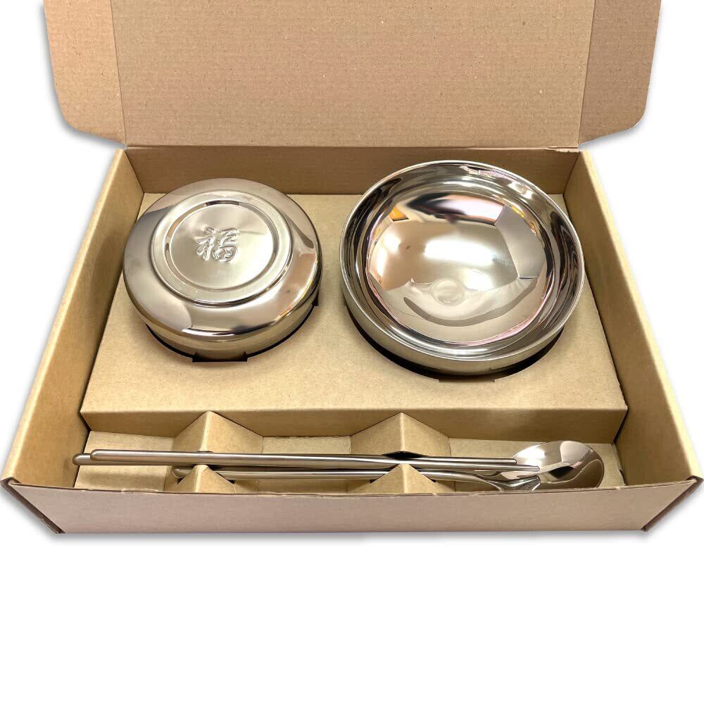 韓国式 茶碗 プレミアム 5点セット [茶碗, 蓋(福印), 箸, スプーン, 汁椀] ステンレス二重食器 保温・保冷 二重中空構造