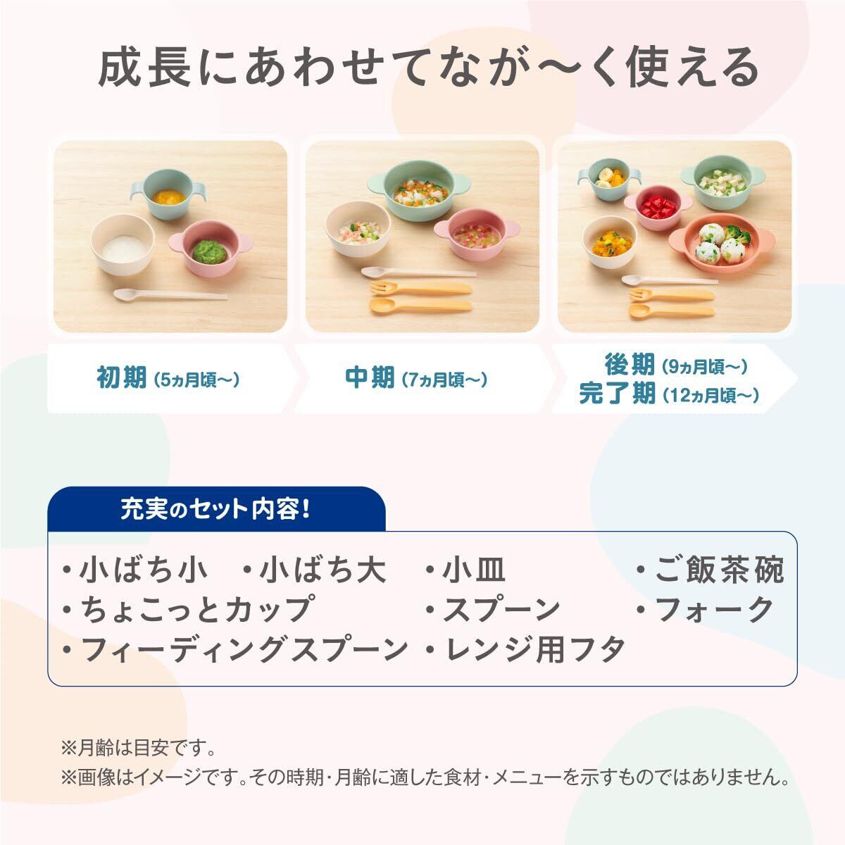 【セット内容:9点】小鉢小・小鉢大・小皿・ご飯茶碗・ちょこっとカップ・スプーン・フォーク・フィーディングスプーン・レンジ用フタ