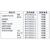 【セット内容/素材】茶碗(ポリプロピレン)・両手コップ(ポリプロピレン)・ランチプレート(ポリプロピレン)・ファーストプレート(ポリプロピレン)スプーン&フォーク(ポリプロピレン)・おやつケース(ポリプロピレン)