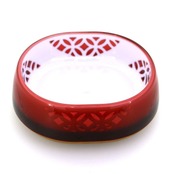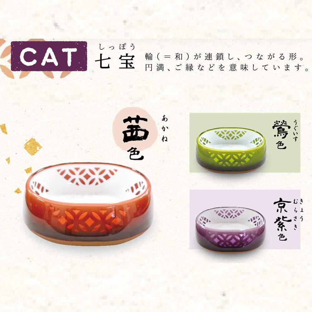・日本の伝統文様「七宝(輪が連続しつながる形。円満・ご縁の意)」と伝統色「茜色」を織り交ぜ、凛とした風合いに仕上げたペット用食器です。・親しみやすく飽きの来ないデザインで愛猫の食卓を彩ります。・インテリアに馴染みやすい3色展開で選ぶ楽しさも魅力です。・ワイドな食べ口なので、ヒゲがあたらず食べやすい! 強化プラスチックの2層構造と底面はゴム付きで滑りにくく安定感も抜群です。