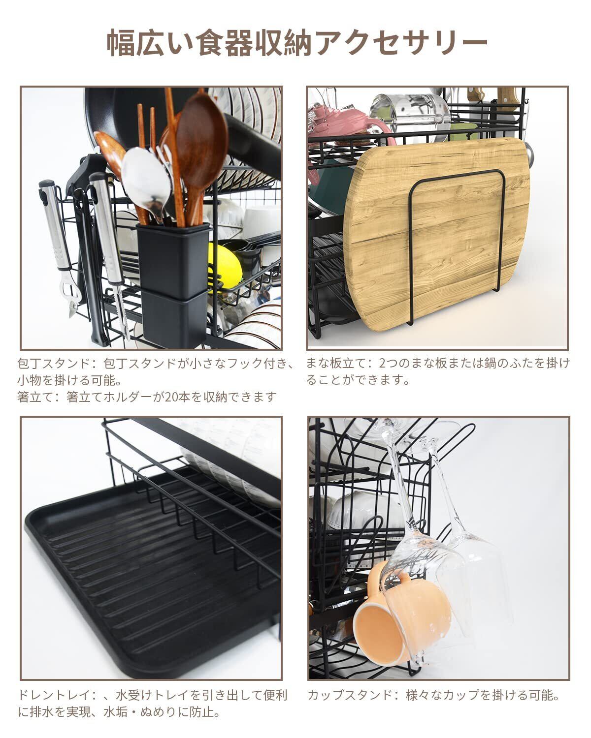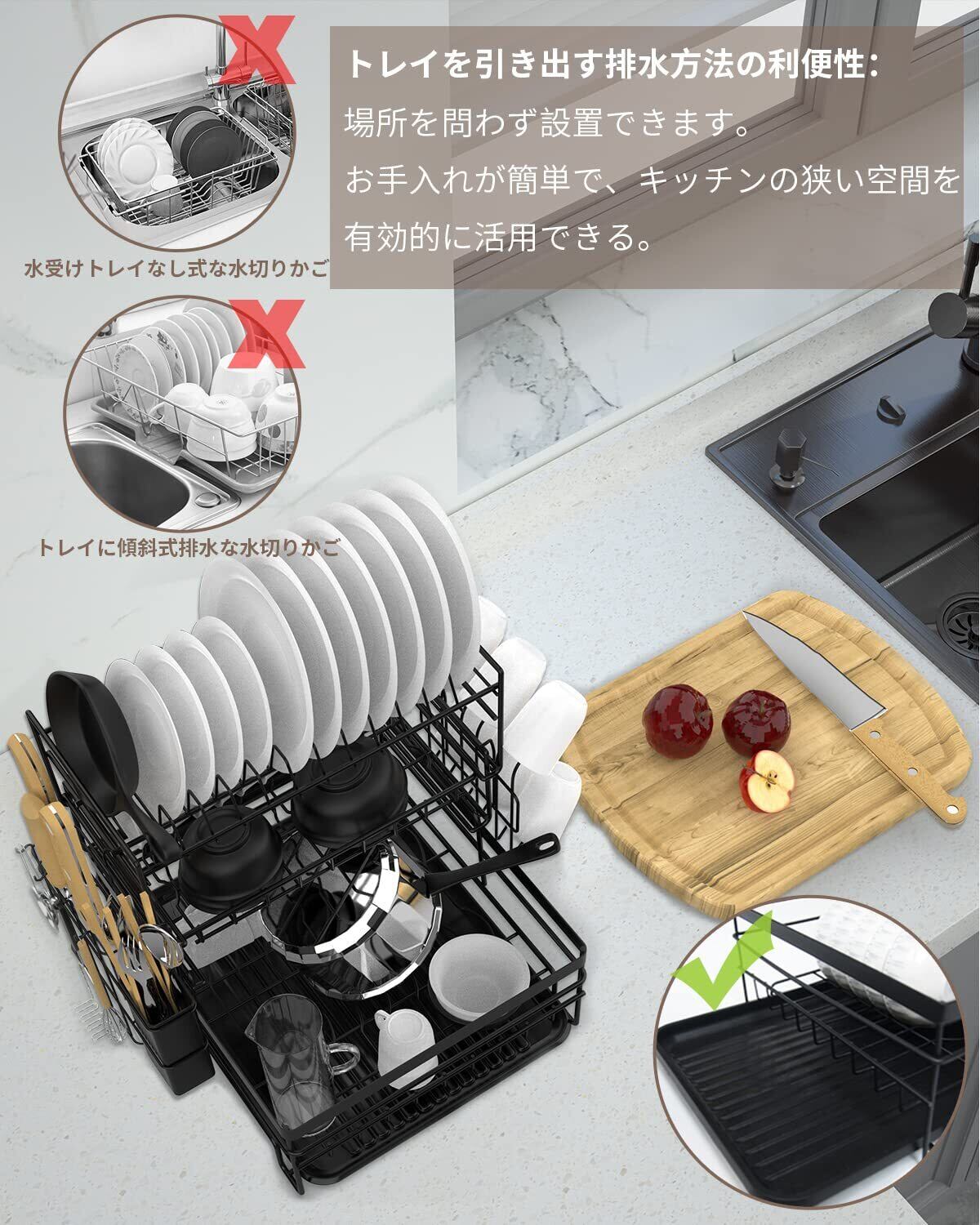 【防錆・傷に強い塗装・頑丈な炭素鋼製】水切りかごの本体表面に粉体焼き付け塗装のコーティングを施すことで、見た目も美しく、高級感があるだけでなく、傷や擦れにも強く、防錆性もとても高く耐久性抜群です。普通のステンレス鋼製水切りラックより、耐荷重25%アップされました。耐荷重およそ40kgでしっかりした骨組み設計で、安定感が良いです。それに、汚れや傷が目立ちにくいブラックを採用して、長期間使用しても見た目が美しいです。