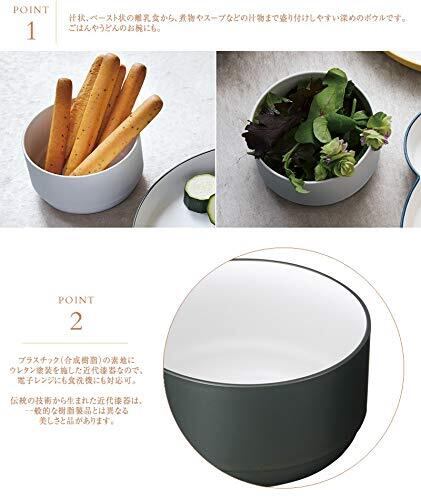 汁状・ペースト状の離乳食から煮物やスープなど汁物まで盛り付けしやすい深めのボウル。ごはんやうどんのお椀にも。電子レンジ・食器洗い乾燥機使用可。なめらかな口元、高度な塗装技術によるスムースな手触りは、受け継がれてきた漆器づくりの職人技と最先端技術の融合によって生まれました。