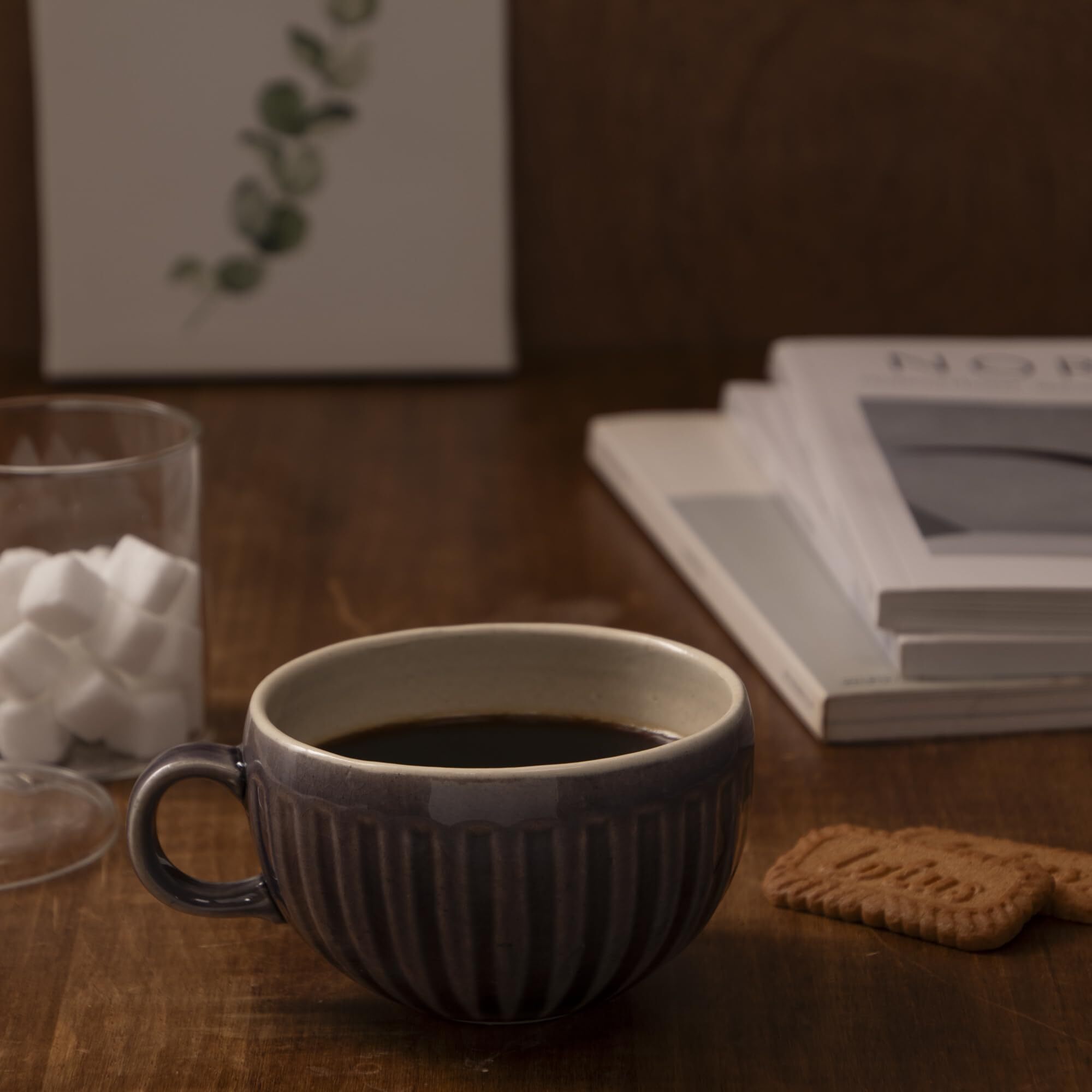 細い線を削った化粧土を裾に巻いたお洒落なスープカップです。