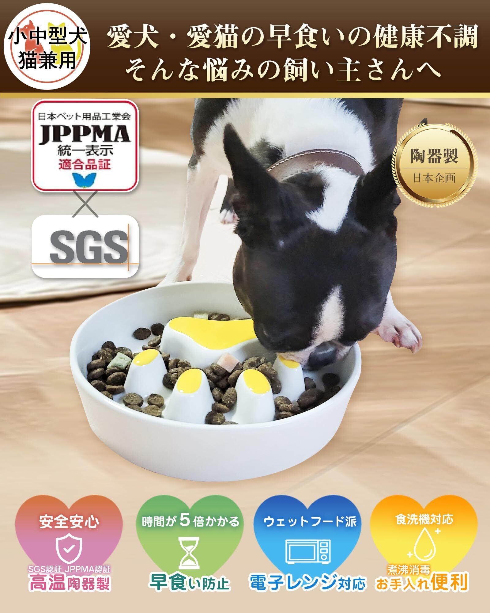 【ペット用食器にも人と同じ安全基準】プラスチックの「早食い防止 食器 犬 猫」が合わないペットちゃんもおり、症状としては接触した部位の赤みや痒み、痒みで掻くことによる脱毛、目やにや流涙などがあります。だから、は身体に害が無い高温陶器を開発しました。猫 犬 早食い防止食器はSGS認証機関による厳しい検査分析により、完全な製品品質がされています。また大切なペットのために、お皿はJPPMA認証商品です。