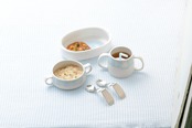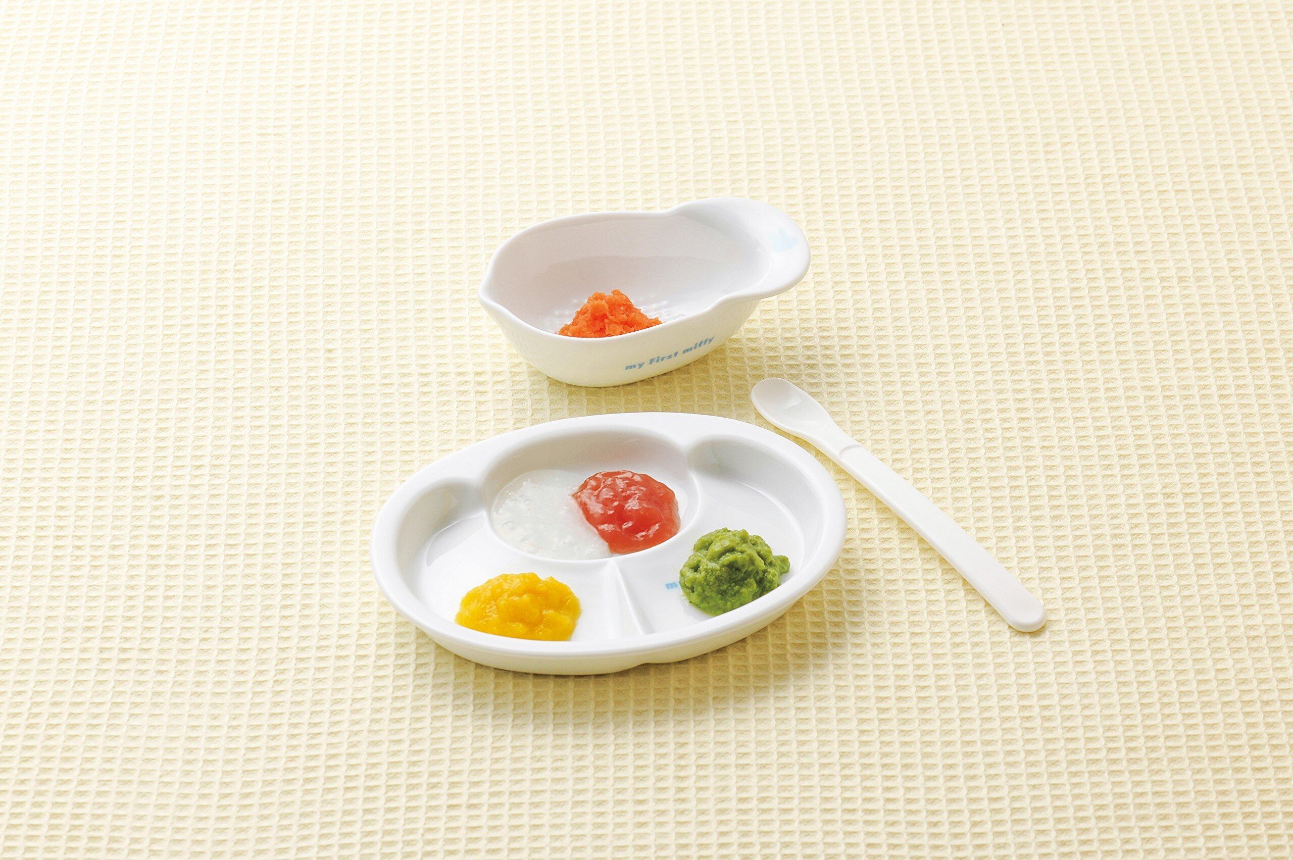 ママが使いやすい離乳初期のグッズと、自分でも支えやすい離乳中期に向けた、初期と中期に使える食器セットです。すくいやすい・こぼしにくい・持ちやすいと形状や素材にこだわっております。環境ホルモンの出ない陶磁器製だから安全で離乳食が楽しくなります。ベビートレーは離乳初期にママが使いやすい仕切りのある取り皿です。食べ物を混ぜる・すくうがスムーズに行えます。ベビーボウルはママの手にすっぽりおさまり離乳初期の赤ちゃんへ食べ物を潰して食べやすいドット付きのボウルです。汁物を別の容器に移しやすいように注ぎ口が付いています。育児スプーンは離乳初期の赤ちゃんの小さな口にぴったりあうように、ママの使いやすさを考えたプラススプーンです。電子レンジ・食器洗い機・煮沸消毒に対応するので、とても便利です。