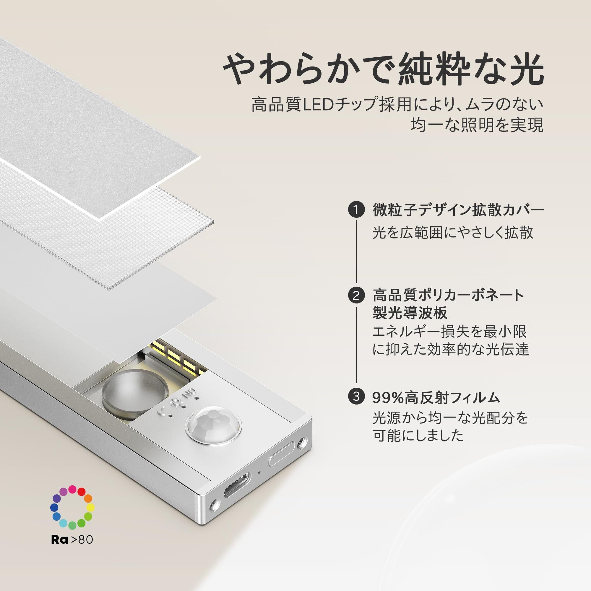 【あらゆる空間で活躍するマルチライト】キッチンキャビネットはもちろん、寝室のベッドサイド・クローゼット内・玄関の靴箱・階段の隅・ディスプレイ棚まで、家中の「暗がりスポット」をワンタッチで解決!高感度人感センサーが動きを感知し、調理中や荷物を持ったままの時でも自動点灯。薄型デザイン(厚さ1cm)で狭い天袋や洗面鏡周りにもスッキリ設置可能。さらに、省エネ設計だから、消し忘れの心配なく家中のあらゆるシーンで活躍します。