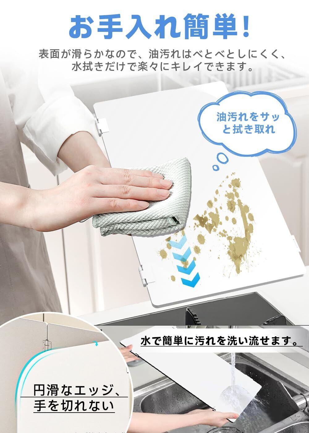 【4枚パネル·油はね防止】油はねガードは調理の需要によって、サイズと形が自由に変えられる便利な4枚パネルでコンロを良く囲って、キッチンの壁に飛び散る料理の油汚れや汁はねなどを逃しません。天麩羅鍋を囲った時の油はね実験にて、飛び散る油を93%以上防ぎました!本製品を使用すれば、いつの間にか壁が汚れてしますということも無くなります。